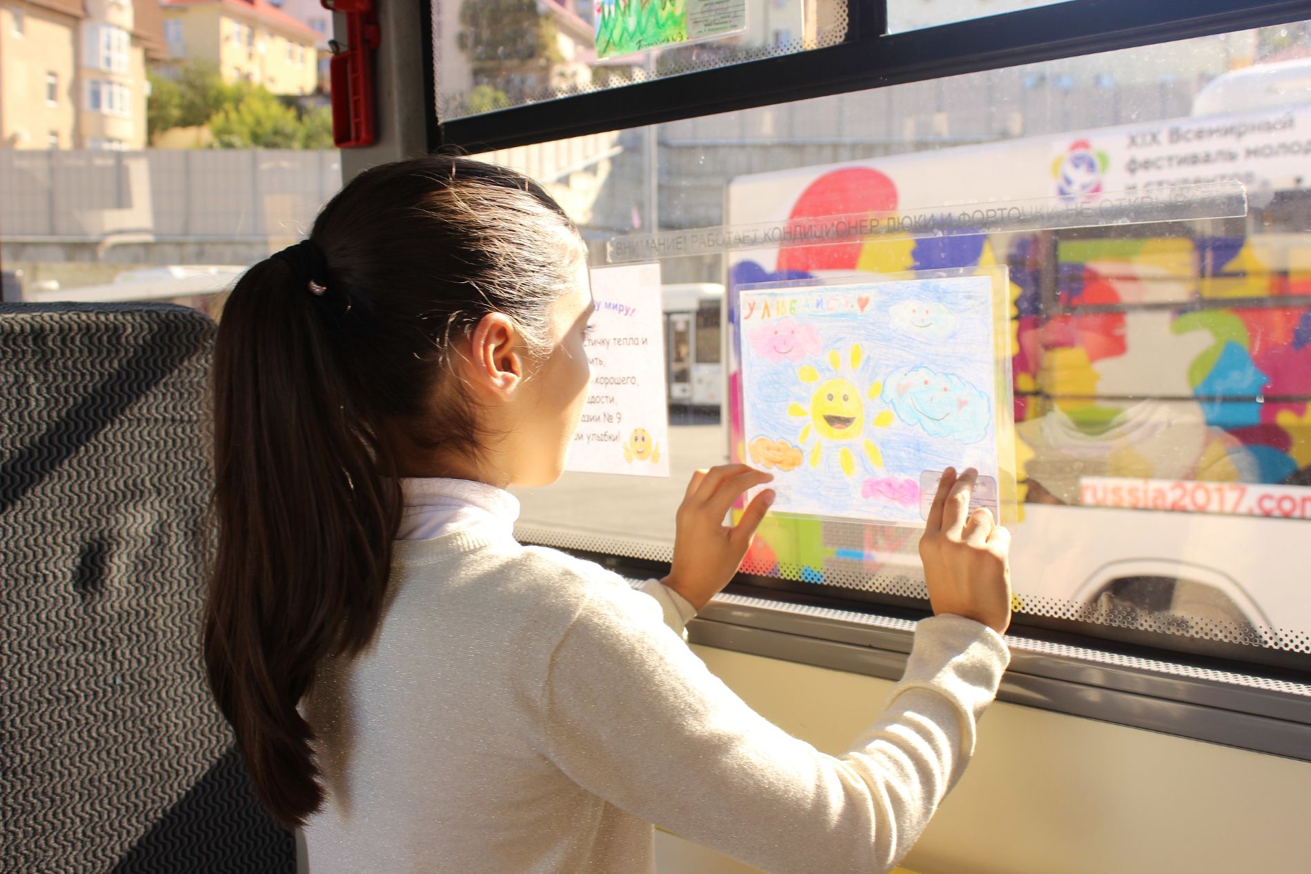 В Сочи на окнах муниципальных автобусов развесили 1 тыс. рисунков, авторами которых стали местные школьники