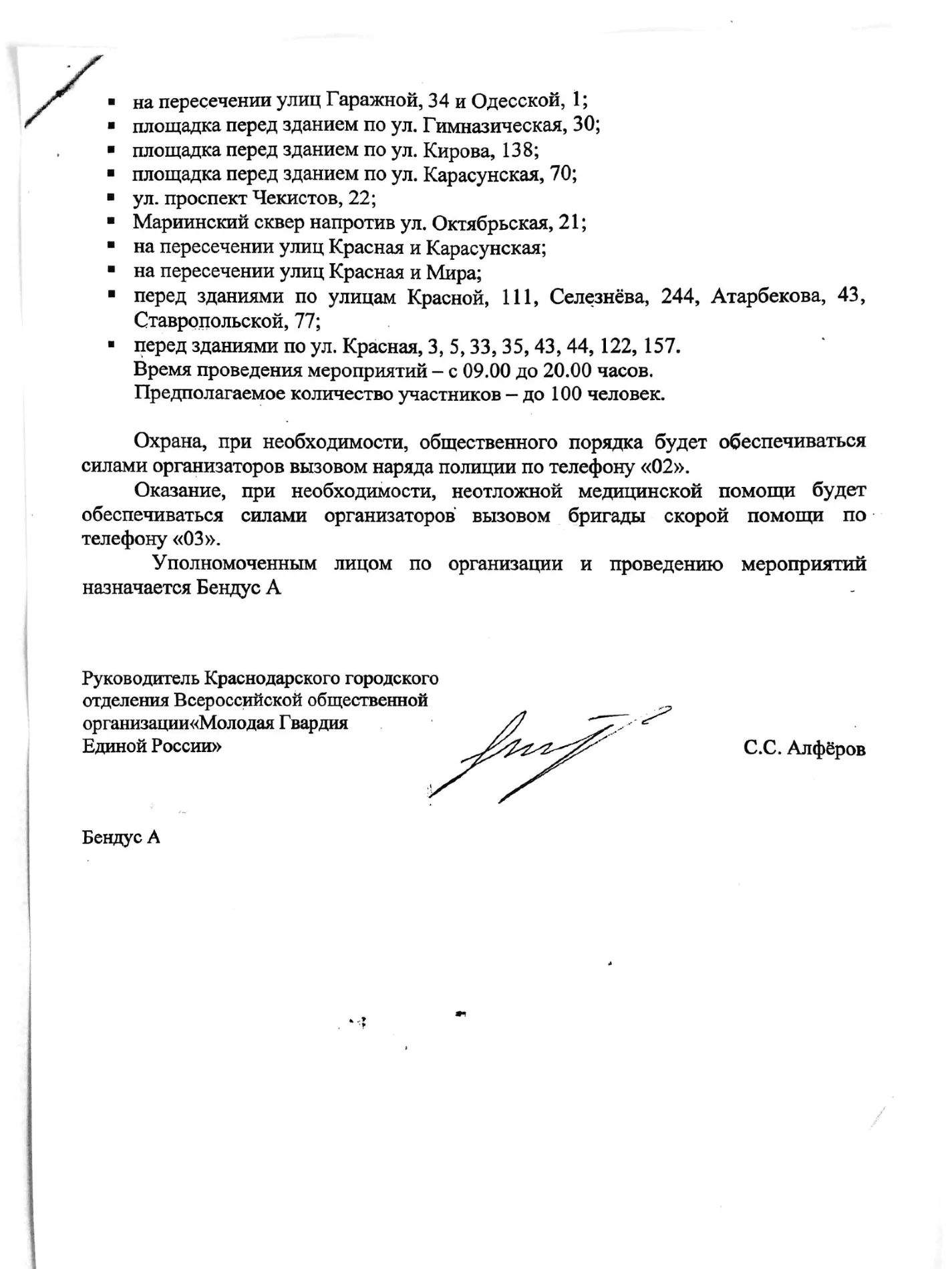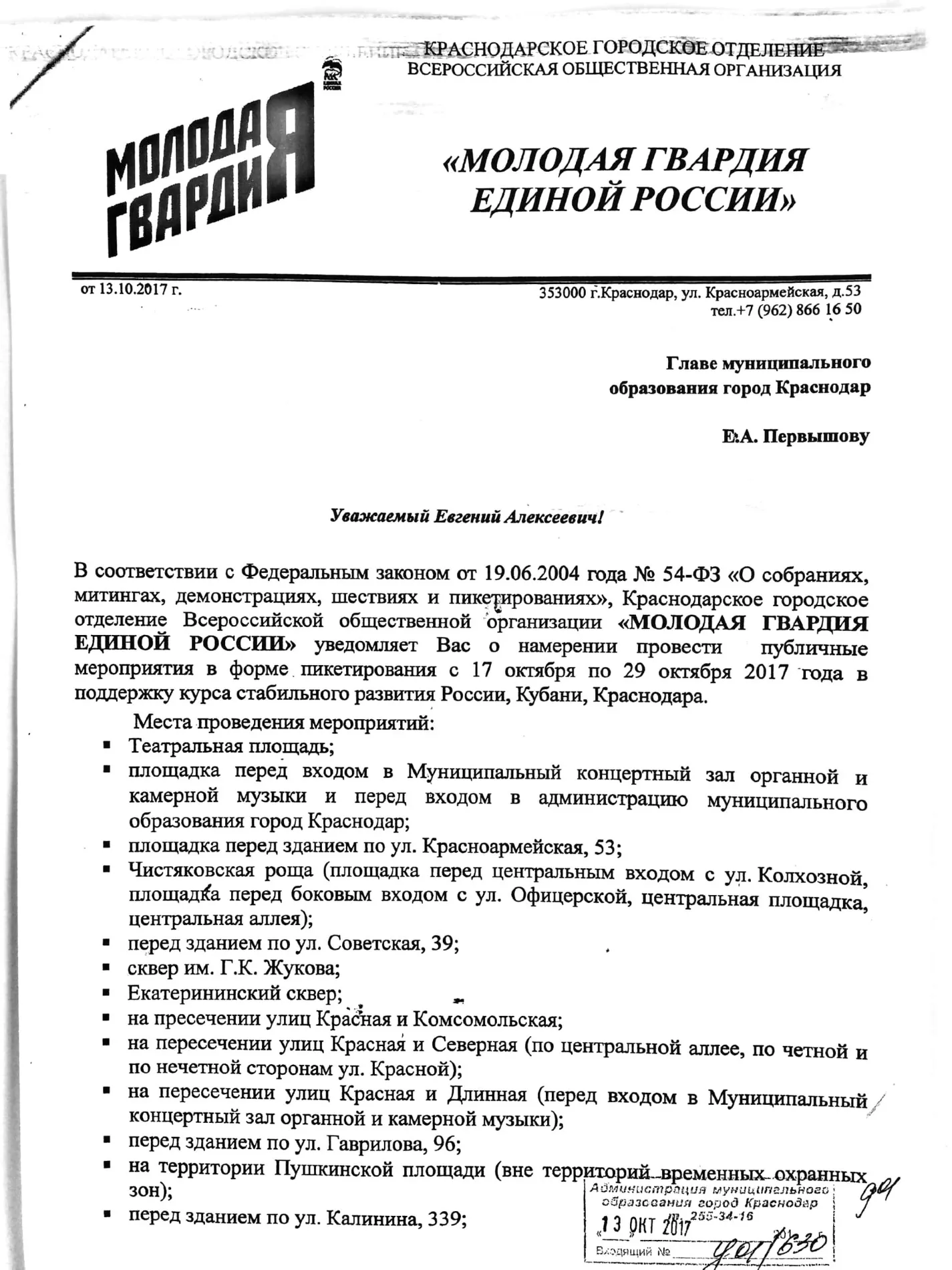 Согласно уведомлению «Молодой гвардии», движение планировало с 17 по 29 октября с 9 до 20 часов проводить на 23 площадках пикеты «в поддержку курса стабильного курса развития России, Кубани, Краснодара». При этом, как заявляют активисты, пока ни одного пикета из заявленных проведено не было.