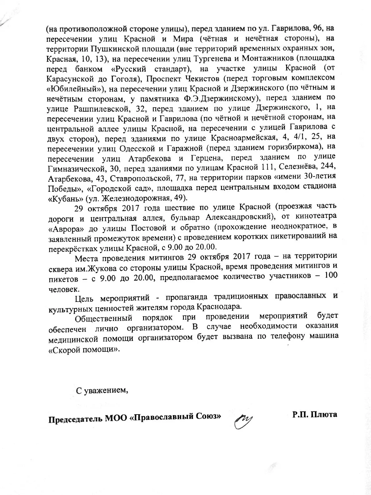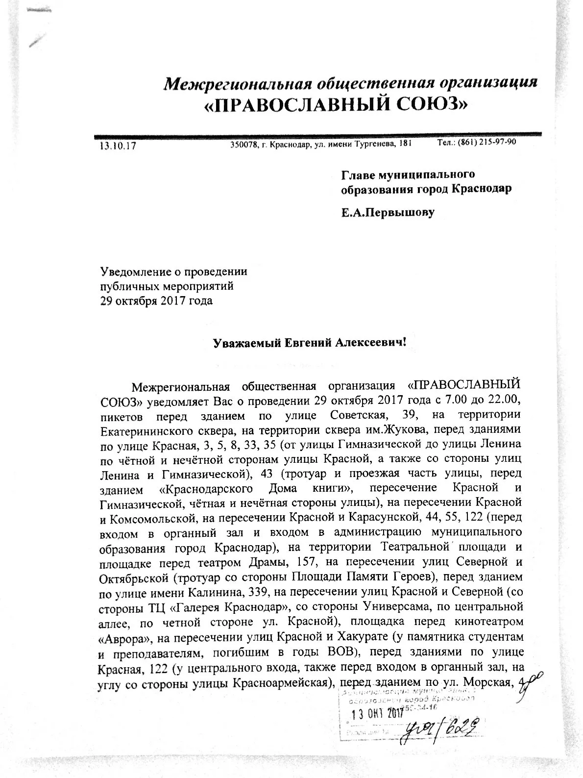 Согласно другому уведомлению, «Православный союз» планирует 29 октября с 7 до 22 часов провести около 50 пикетов в разных частях города, шествие по ул. Красной «с проведением коротких пикетирований» на перекрестках с 9 до 20 часов и митинг напротив краевой администрации с 9 до 20 часов. Цель мероприятия — «пропаганда традиционных православных и культурных ценностей жителям Краснодара».