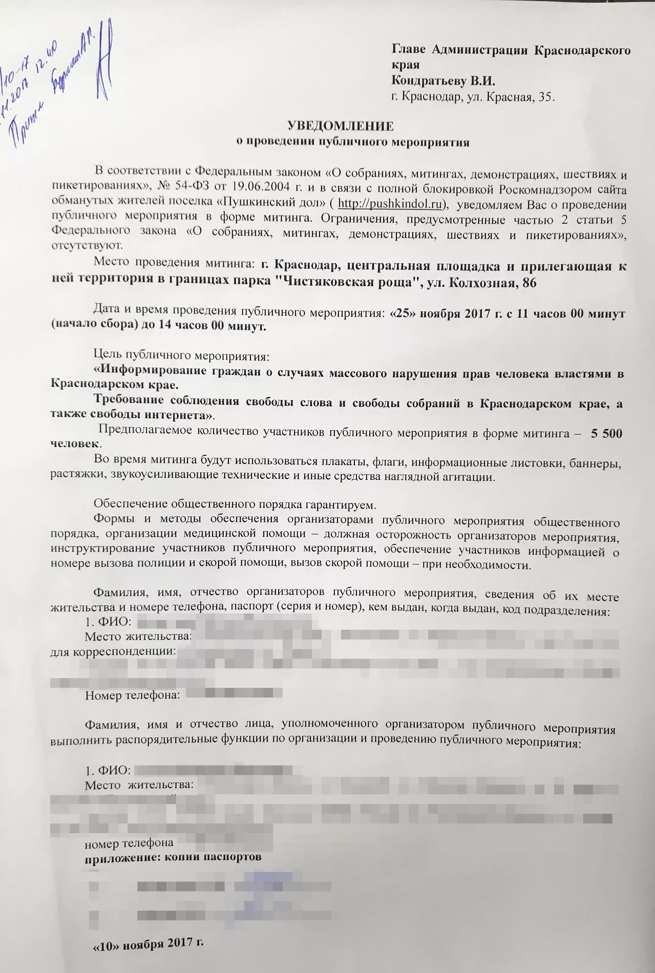 «Мы не задумывались о защите свободы слова до тех пор, пока эта свобода не была нарушена. Мы не задумывались о защите свободы собраний до тех пор, пока эта свобода не был нарушена. И теперь мы узнали, что эти права и свободы массово нарушаются в России, и не только у обманутых жителей "Пушкинского дола", но и сотен и тысяч граждан нашей страны», — говорится в группе митинга в Краснодаре в фейсбуке.