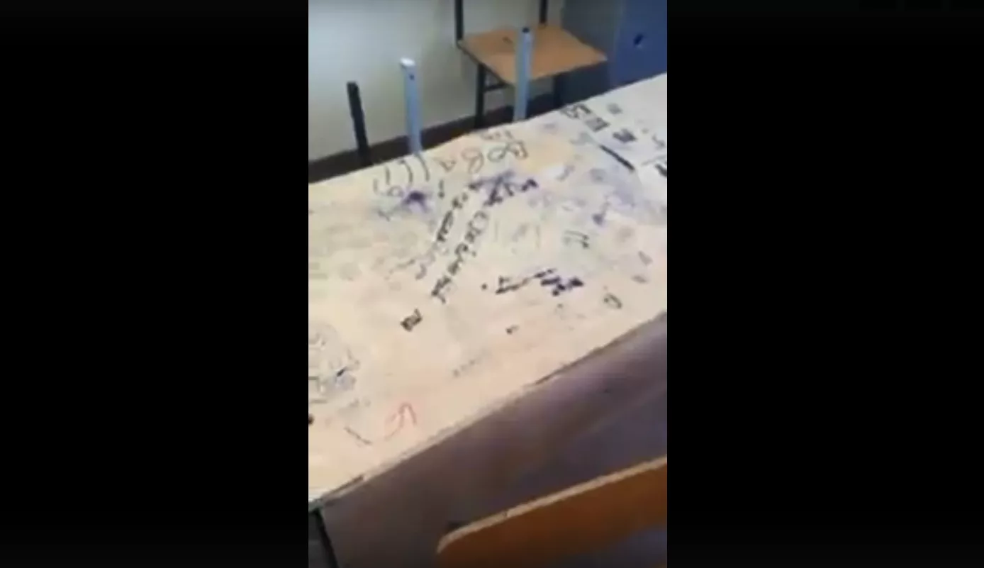 Женщина показала, что дверь учебного кабинета плохо держится, столы исписаны и исцарапаны, стулья сломаны, со стен отваливается штукатурка.