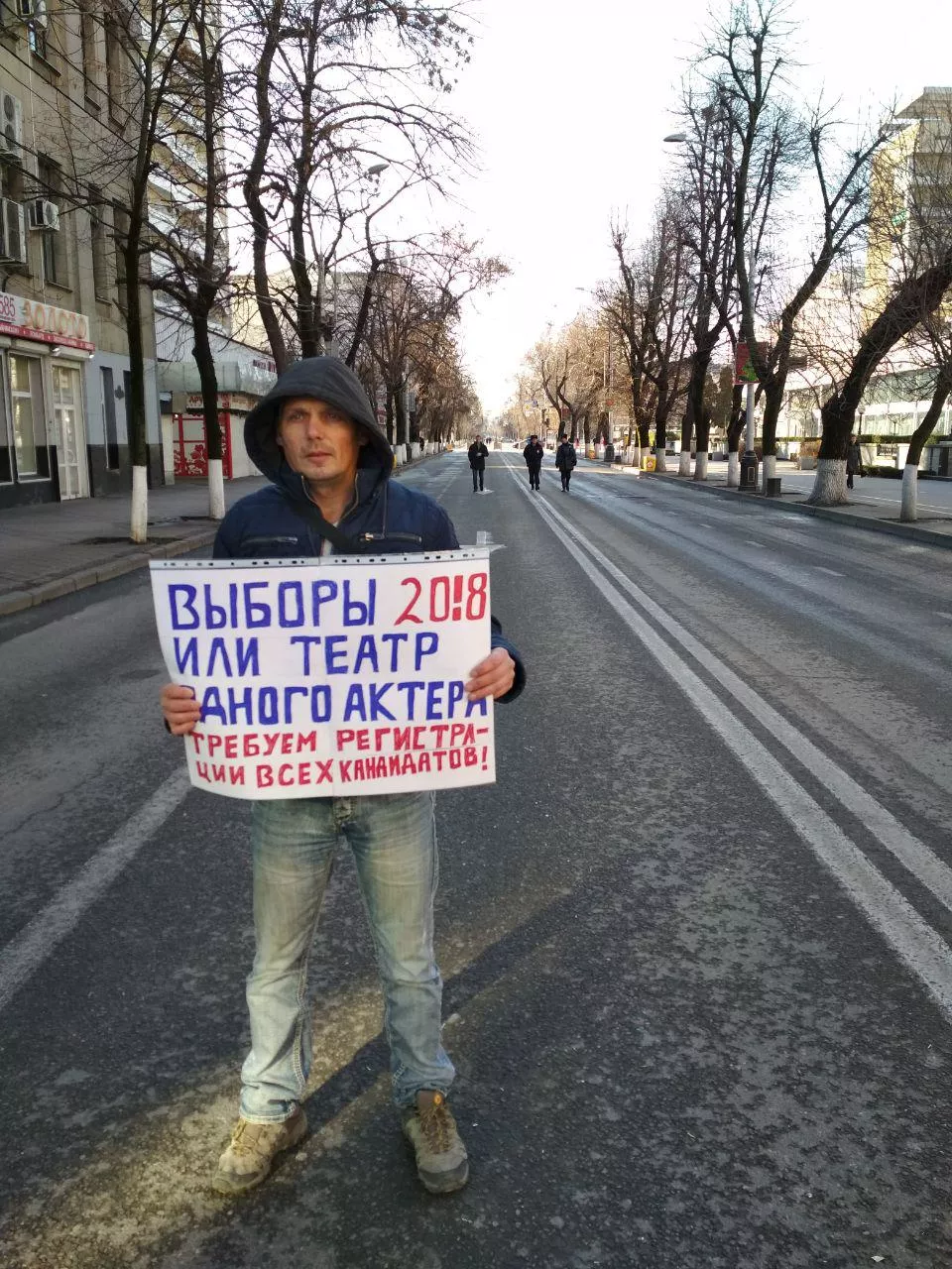 Пикеты начались с 8 часов утра, активисты планируют проводить акцию до 22 часов, сменяя друг друга. В руках они держат плакаты с надписями: «Выборы 2018 или театр одного актера? Требуем зарегистрировать всех кандидатов», «Не признаем президента, что боится конкуренции», «Выборы без выбора — обман».