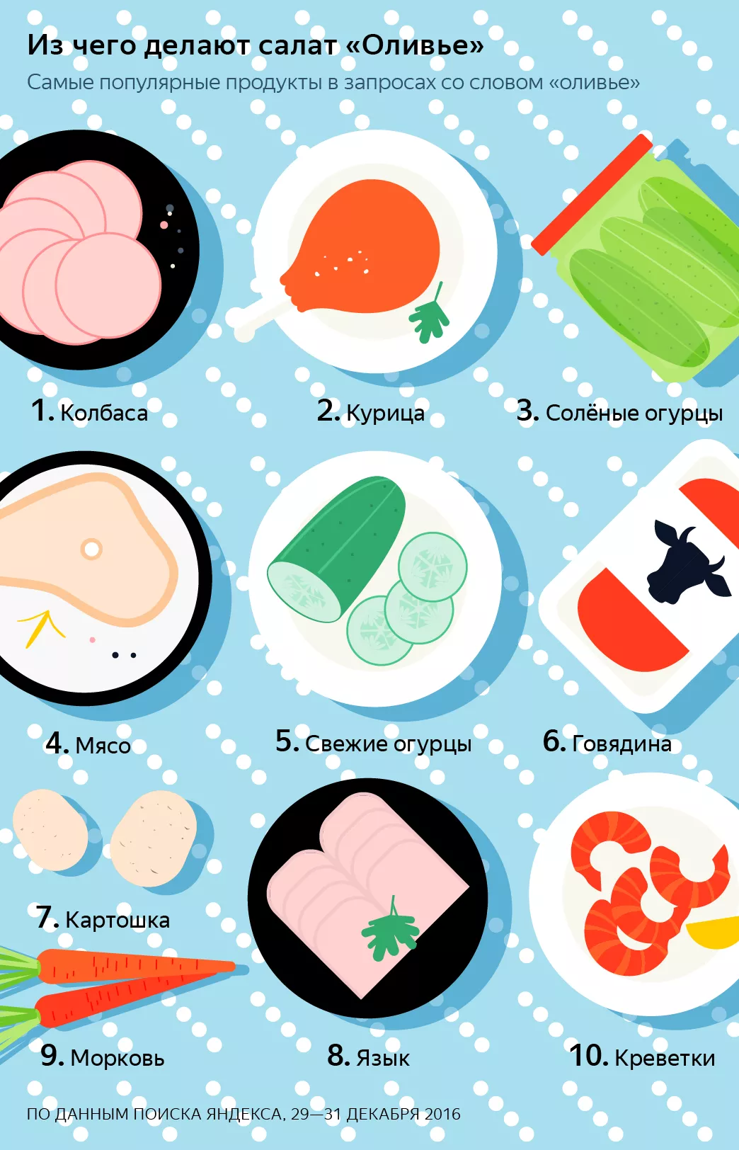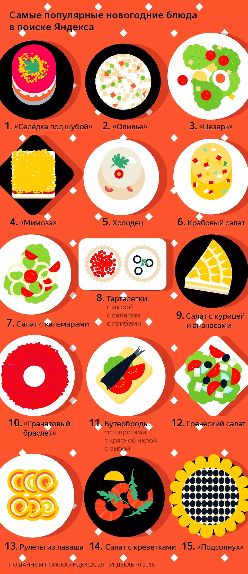 Самым популярным салатом стала «Селедка под шубой», при этом чаще всего о ней спрашивали на Дальнем Востоке. «Оливье» занял второе место, «Цезарь» — третье. Также популярна «Мимоза», а запросов из Москвы и Санкт-Петербурга в полтора раза больше, чем в общем по стране. Пятерку популярных блюд замыкает холодец.