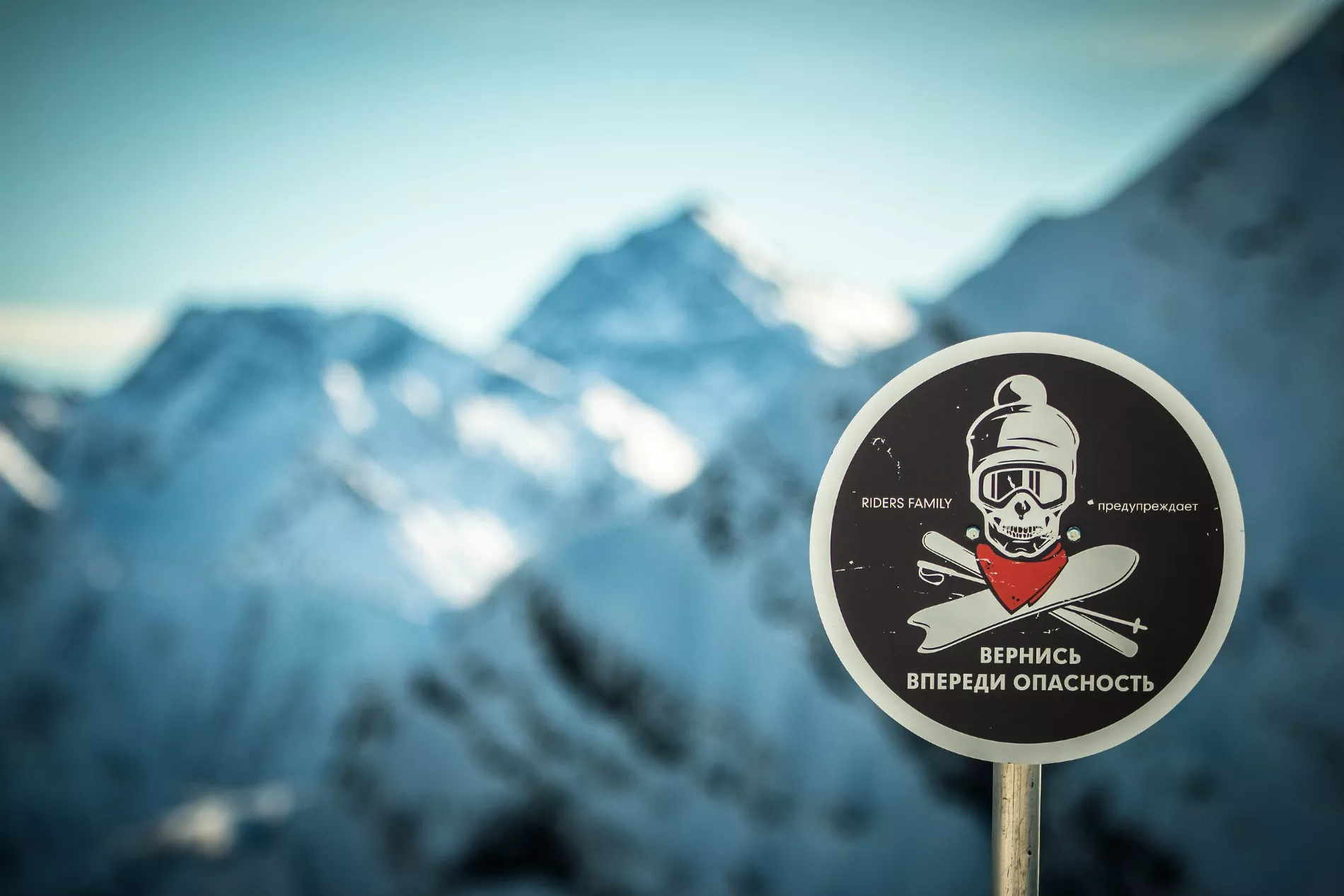 На черном фоне изображен череп в лыжной шапке, вместо костей перекрещены лыжи, палки и сноуборд. «Вернись, впереди опасность», — говорится в надписи.