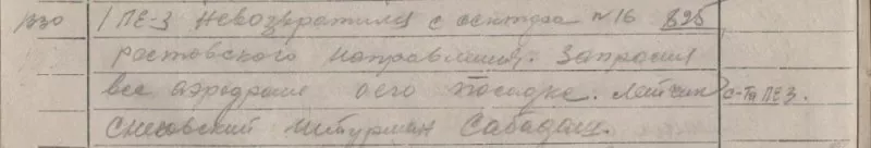В результате выяснилось, что крушение потерпел самолет Пе-3бис № 40312, который был зачислен 4 сентября 1942 года в состав 27-й отдельной разведывательной эскадрильи ВВС Черноморского флота. Также по архивным данным, в том числе и Берлинского архива, установлено, что этот самолет-разведчик 4 октября 1942 года не возвратился с боевого задания по разведке войск противника на Ростовском направлении. Управляли самолетом пилот — сержант Михаил Снеговский из Ульяновска и штурман — воздушный стрелок Борис Сабодаш, уроженец Каменец-Подольска.