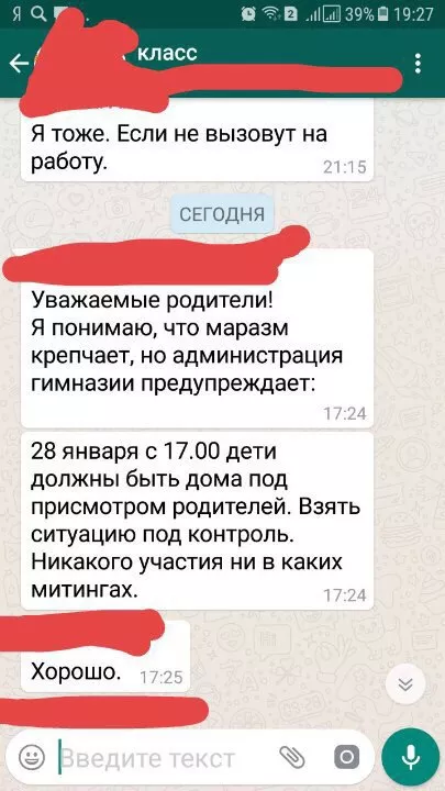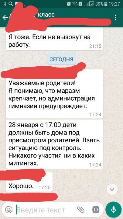 В группе «Подслушано в 16 гимназии г.Сочи» в соцсети «ВКонтакте» также опубликован скрин переписки с призывом к родителям не пускать детей на забастовку избирателей, которую сторонники Навального проводили 28 января.