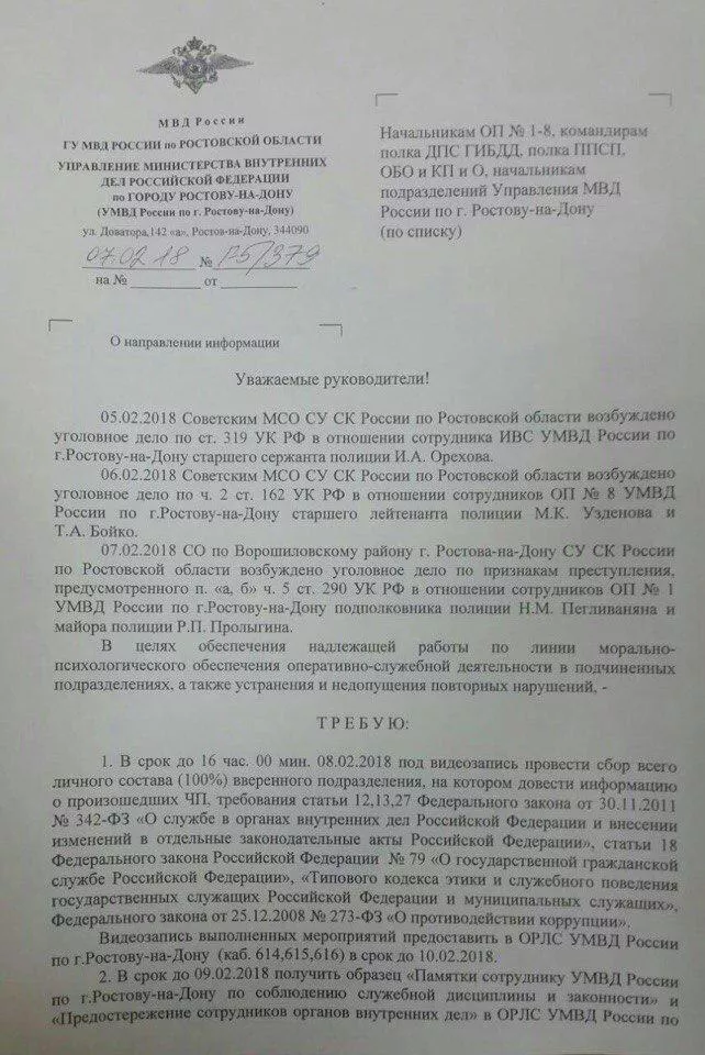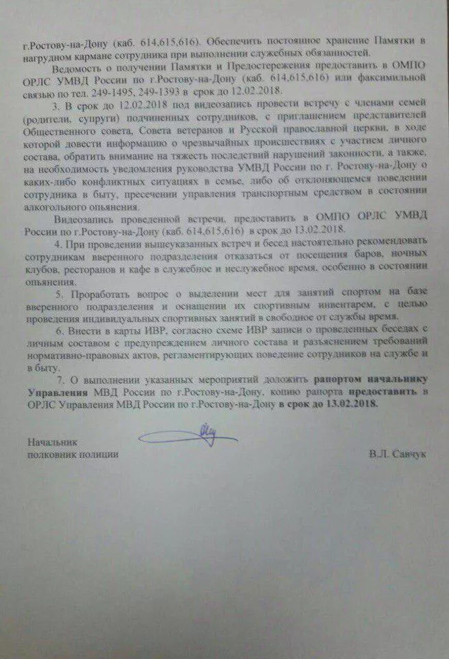 Документ подписан начальником УМВД Ростова Владимиром Савчуком 7 февраля «в целях надлежащей работы по линии морально-психологического обеспечения оперативно-служебной деятельности». Начальникам подразделений полиции рекомендуется провести общий сбор личного состава, напомнить сотрудникам о кодексе этики и вручить «Памятку сотрудника УМВД».