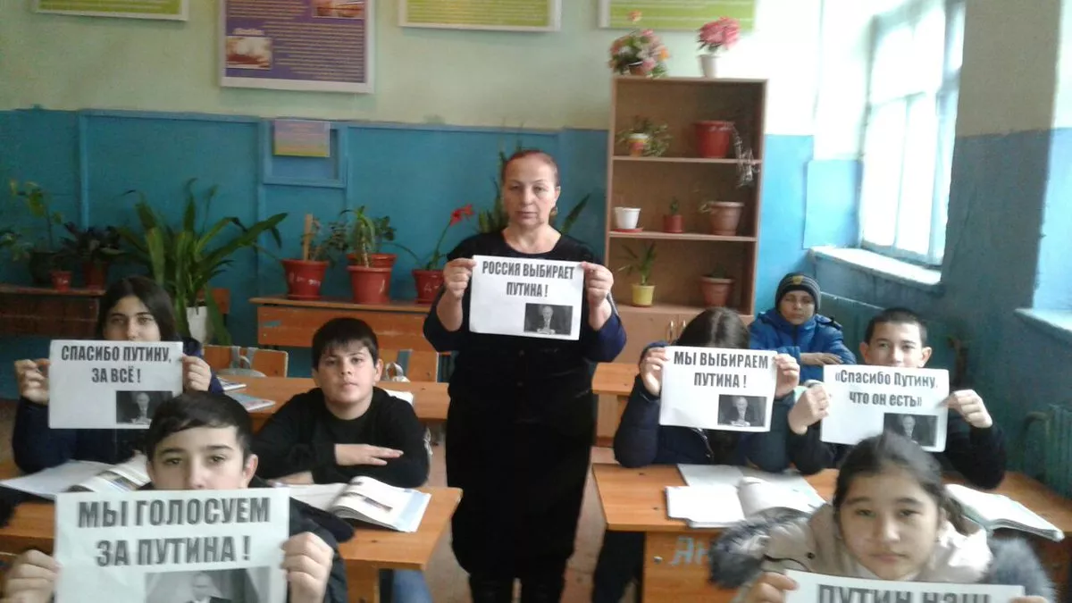 В соцсетях появляются снимки учащихся дагестанских школ с плакатами в поддержку кандидатуры Владимира Путина на предстоящих выборах. Когда наблюдатели обращают на них внимание, посты удаляют