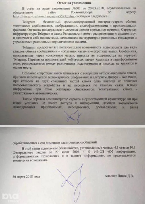 Об этом написал в своем Telegram-канале Павел Чиков, который является руководителем международной правозащитной группы «Агора», представляющей мессенджер в судах. Он опубликовал фотографию ответа на уведомление Роскомнадзора.