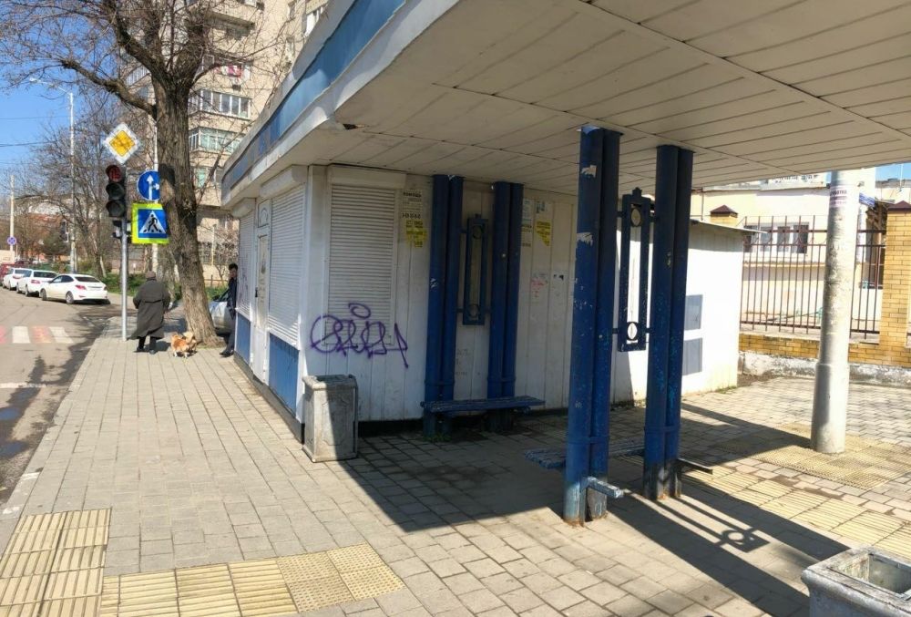 В Краснодаре демонтируют установленный в пешеходной зоне торговый павильон на улице Красина, 3, который пристроили к остановке
