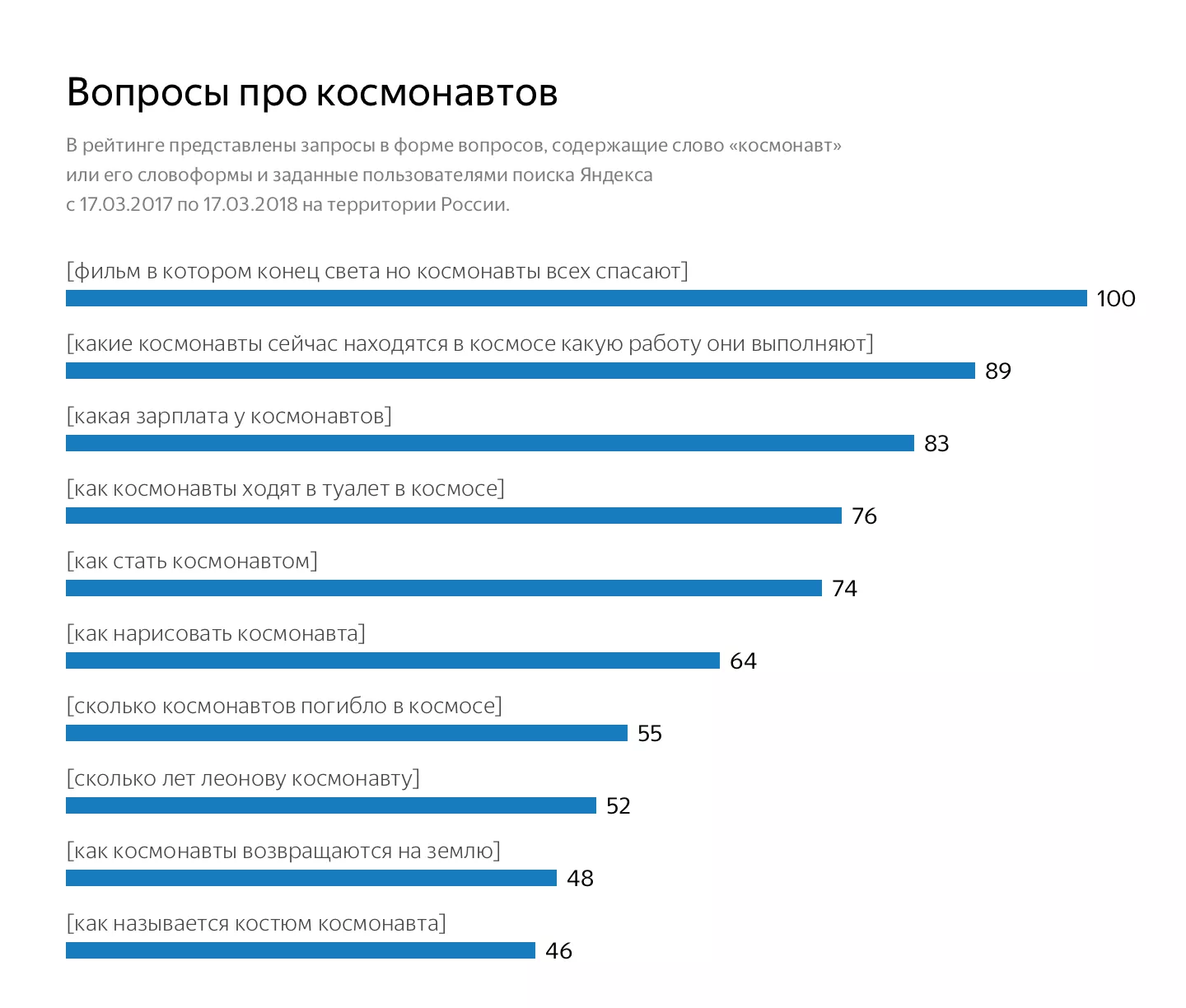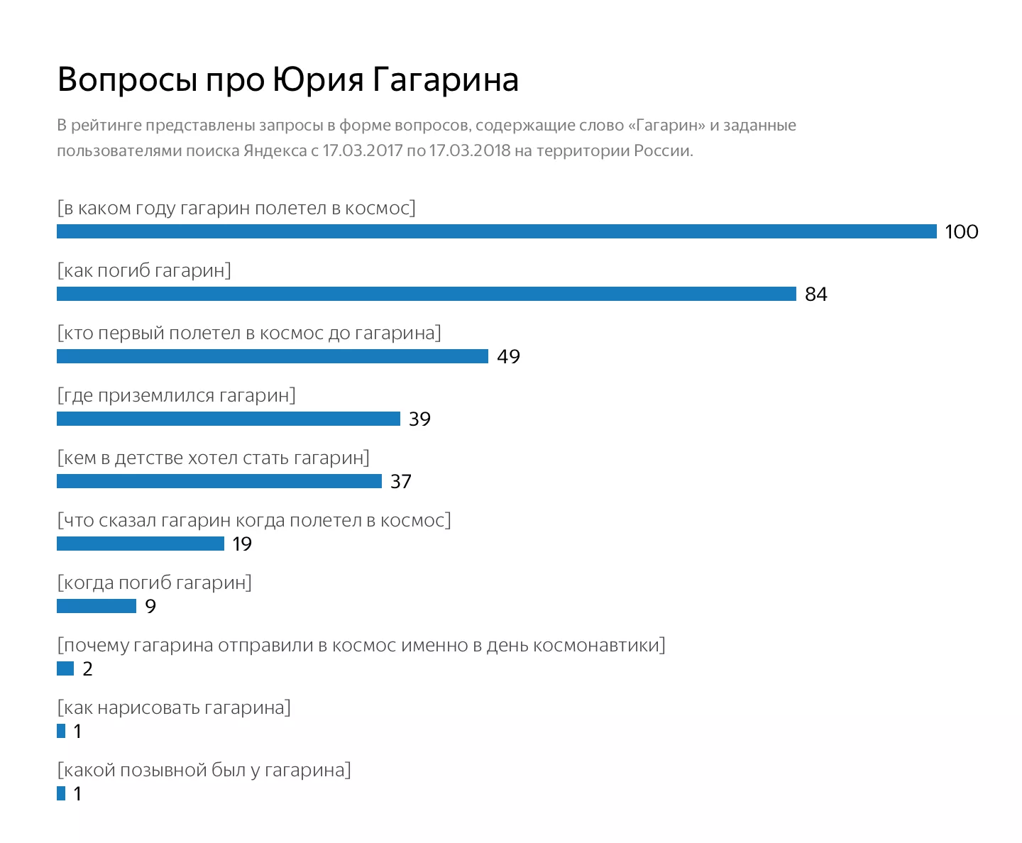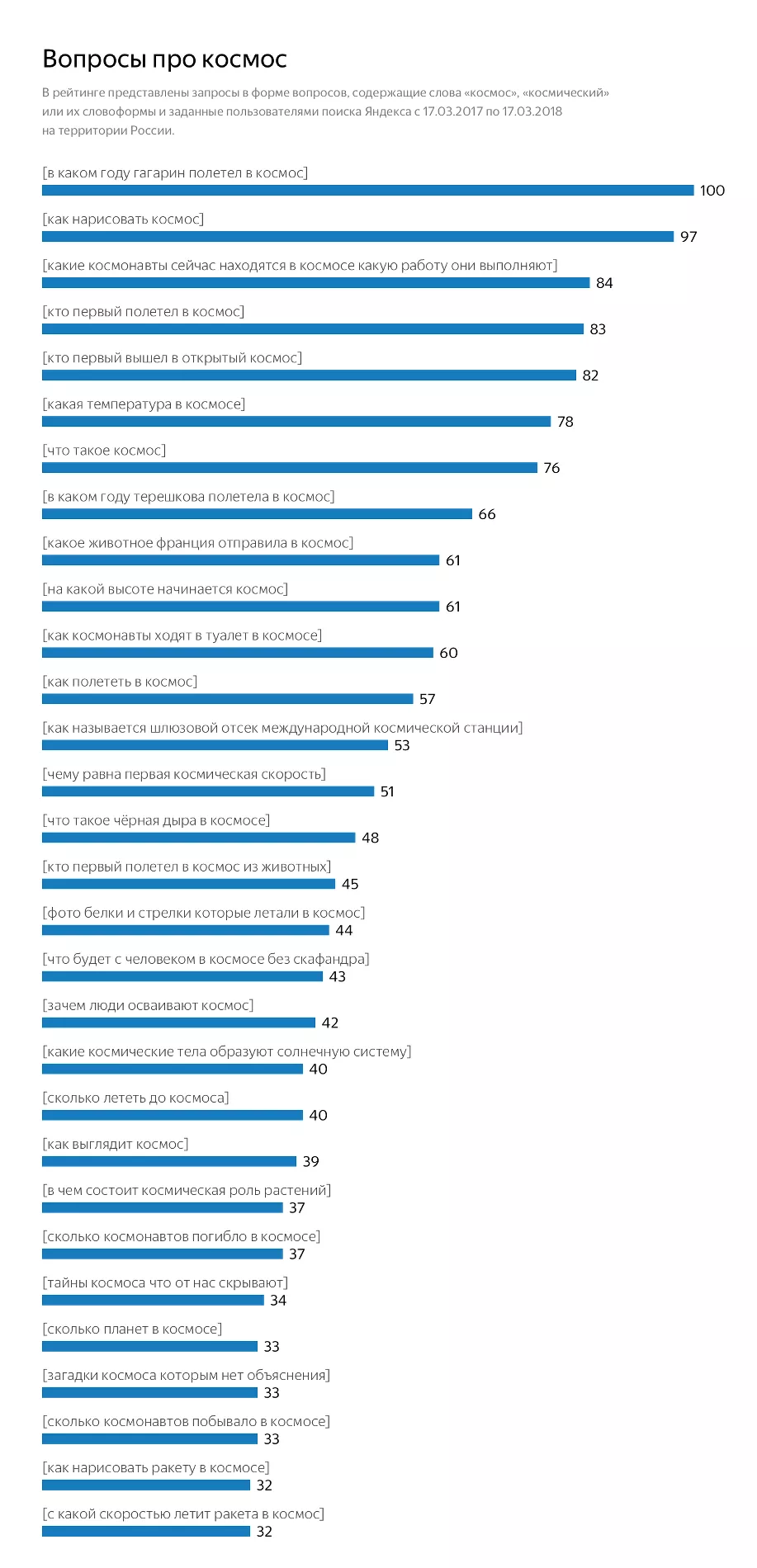 Рейтинг составлялся по данным запросов пользователей из России, собранным с марта 2017 года. В топе запросов, содержащих слово «космос» или его производные, на первом месте оказался вопрос «в каком году Гагарин полетел в космос».