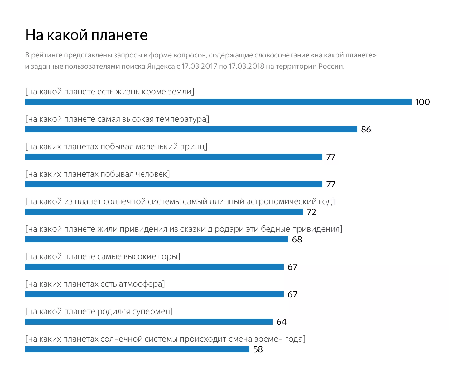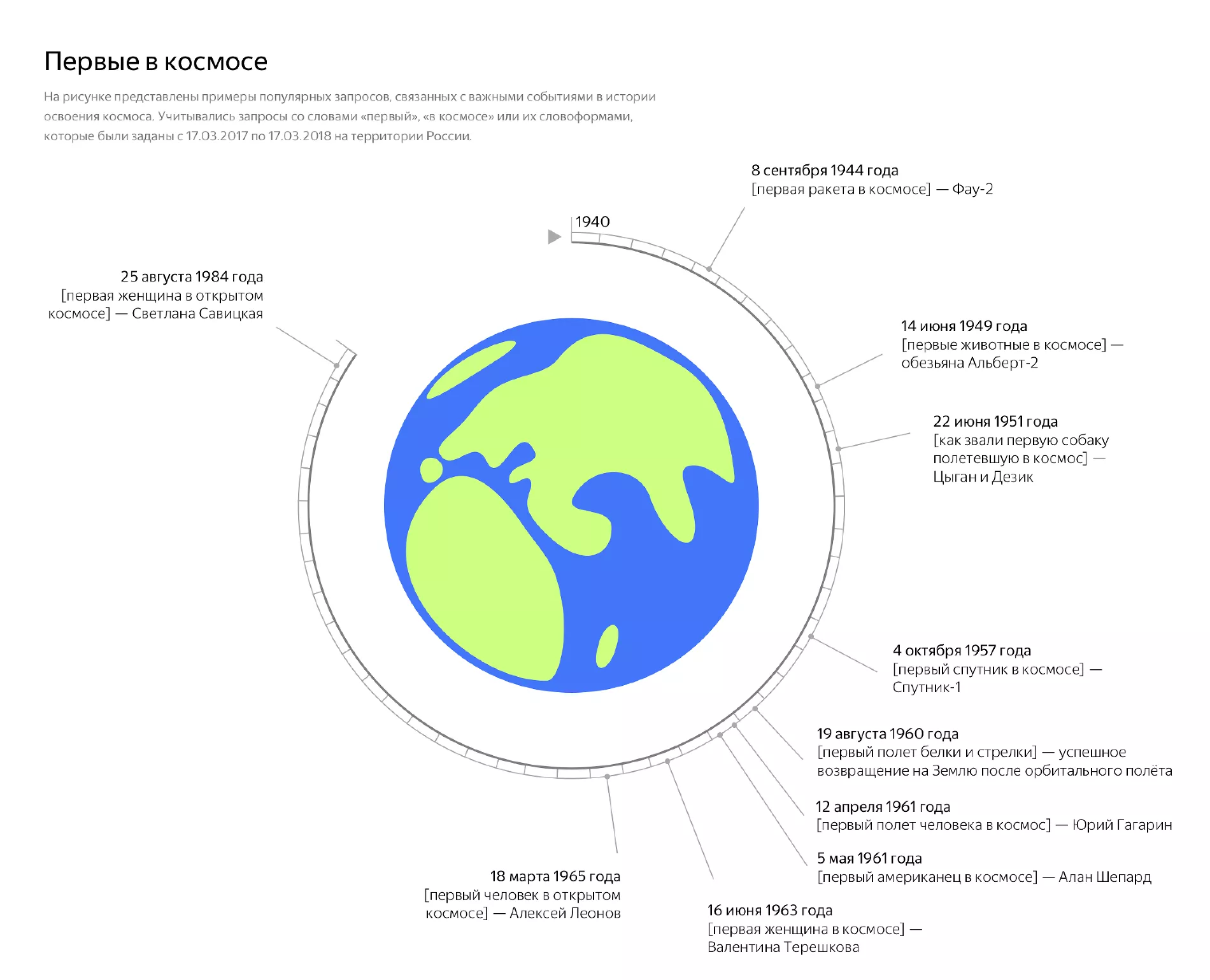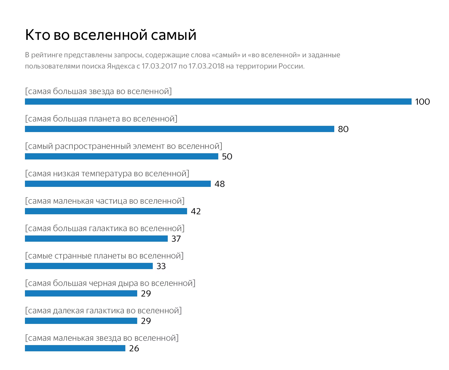 Рейтинг составлялся по данным запросов пользователей из России, собранным с марта 2017 года. В топе запросов, содержащих слово «космос» или его производные, на первом месте оказался вопрос «в каком году Гагарин полетел в космос».