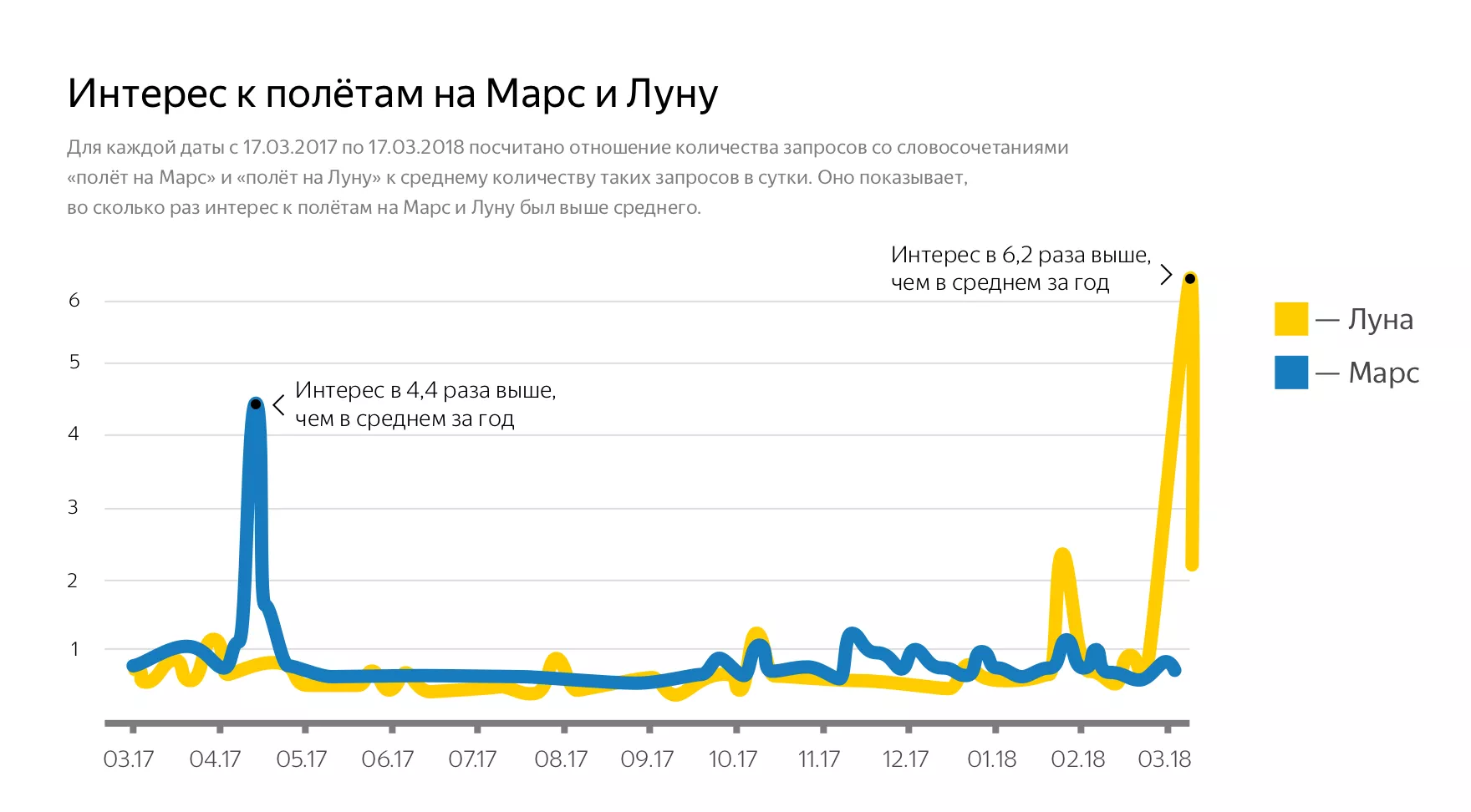 В графике об интересах к полетам на Марс и Луну отражено отношение числа запросов с соответствующими словосочетаниями к среднему количеству таких запросов в сутки. Так, полетом на Луну больше всего интересовались в День космонавтики, 12 апреля. Пик интереса к полетам на Марс произошел 15 марта, когда президент РФ Владимир Путин анонсировал российскую миссию на эту планету в 2019 году.