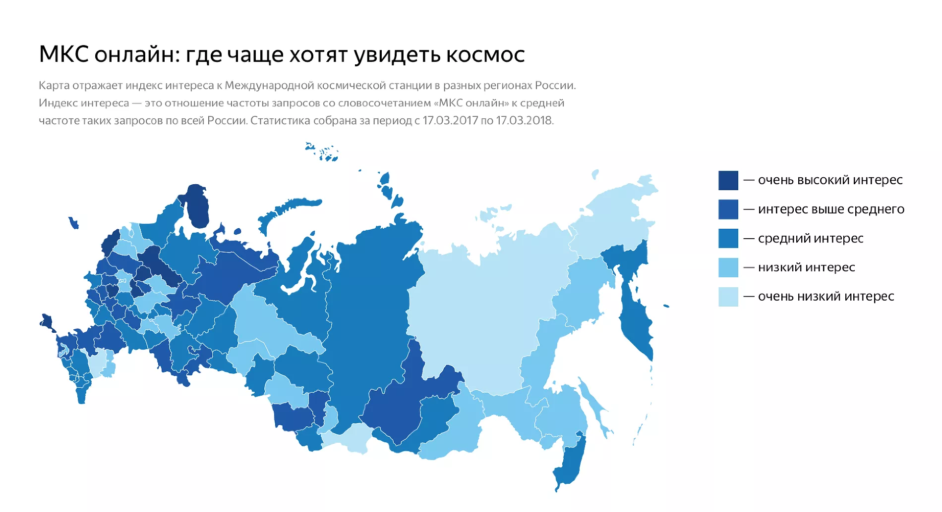 Также «Яндекс» представил карту, на которой отражен индекс интереса к Международной космической станции в разных регионах России.