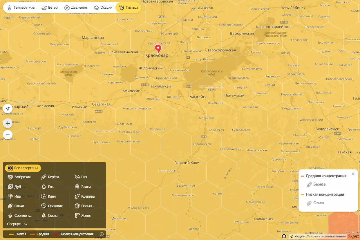 На «Яндекс.Погоде» появилась карта пыльцы для аллергиков Краснодара