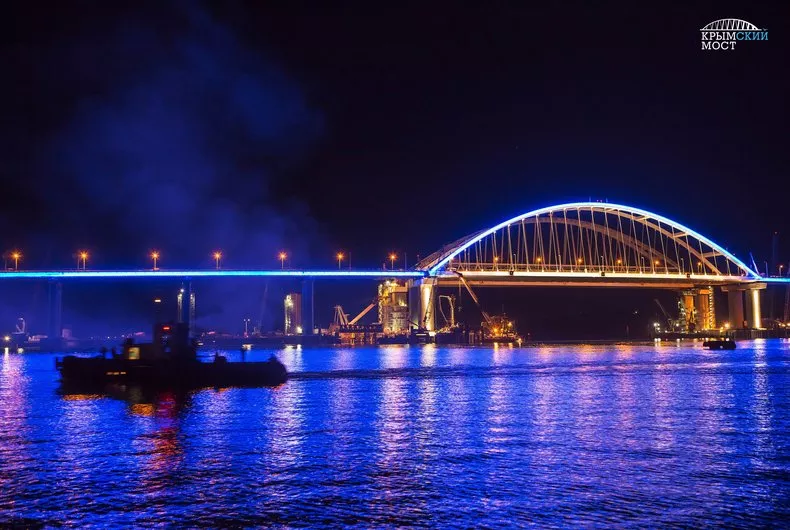На Крымском мосту строители провели тестовое включение подсветки автодорожной арки