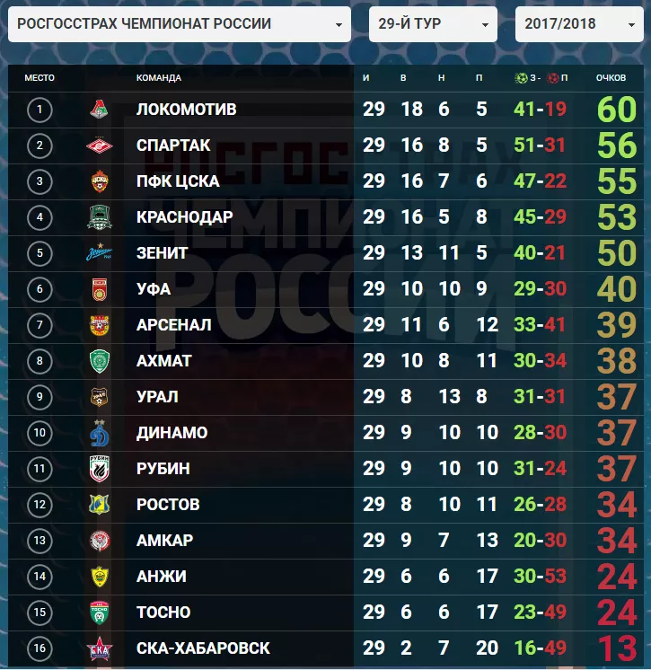 За тур до конца чемпионата России шестую строчку занимает «Уфа», набравшая 40 очков. На одно очко меньше у «Арсенала», «Ахмат» отстает на два очка, «Урал», «Динамо» и «Рубин» — на три.