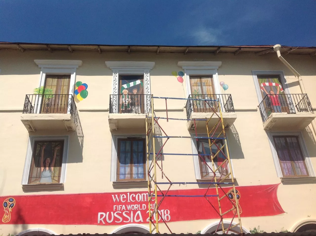 «Этот дом нежилой, людей расселили. Дом хотели реконструировать, но собственник принял решение не просто завесить его баннером, а украсить оригинальным способом. Я подготовил несколько эскизов, в итоге выбрали тот, где люди изображены в окнах. Это своеобразный подарок городу перед ЧМ. На днях уберем забор рядом с домом, там нарисовано кафе, красивая арка. Над проектом работали шесть художников. Столкнулись и с негативными высказываниями от горожан. Но надо было что ли грустных людей рисовать?» — отметил в беседе с журналистом Юга.ру Долондуцкий.