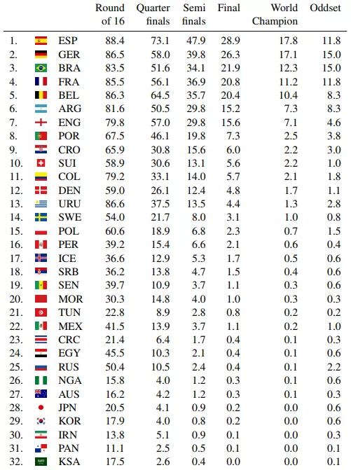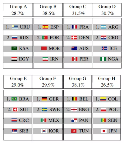 Математики рассмотрели 100 тыс. вариантов развития событий на мундиале. Учитывались разные факторы, среди которых ВВП и население стран-участниц, рейтинг сборных, средний возраст игроков, количество футболистов в Лиге чемпионов, а также итоги прошлых чемпионатов мира, начиная с 2002 года. Ученые акцентировали, что на итоги исследования значительно повлияла структура турнира и разделение команд по группам.