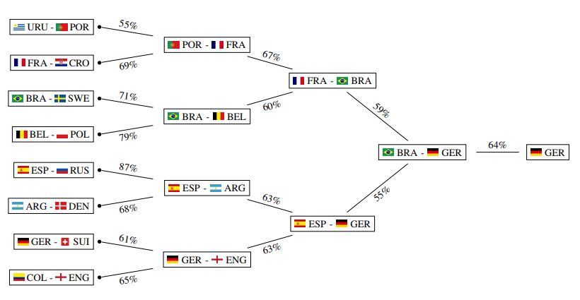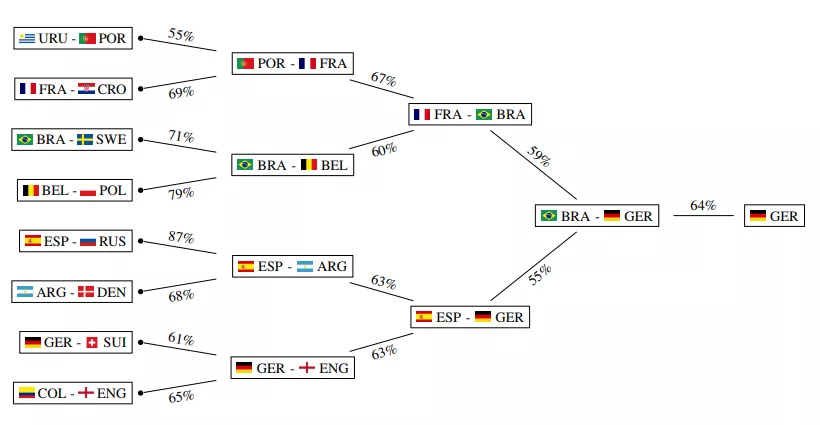 При расчете вероятности выигрыша каждой из 32 команд математики использовали метод ранжирования совместно с алгоритмом random forest («случайный лес»), в котором каждое дерево — вариант развития событий, листья — события, а ветки — условия, которые к ним приводят.