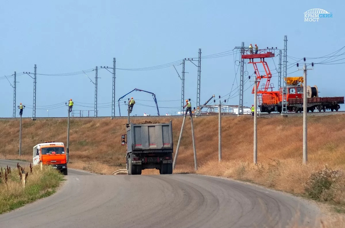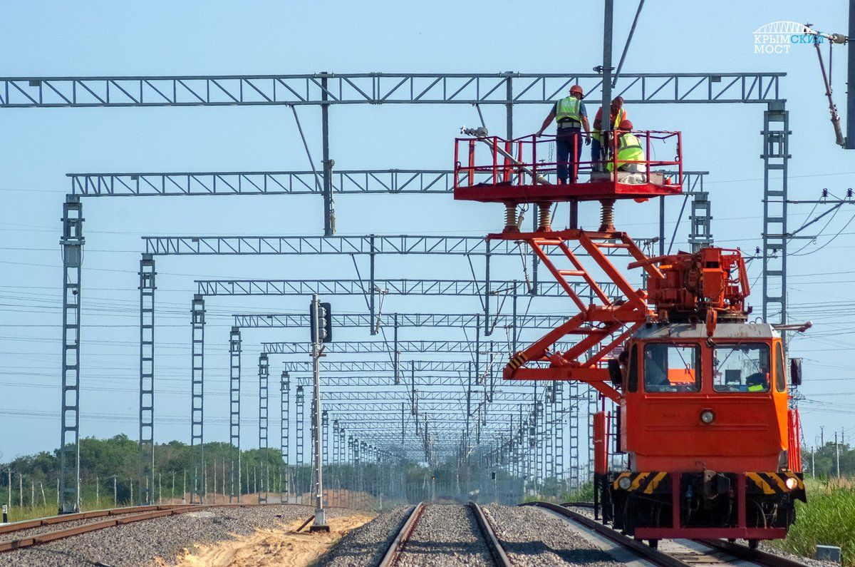 Уже готово более 80% верхнего слоя железной дороги, которая соединит Крым и Кубань через станцию Вышестеблиевская, передает инфоцентр «Крымский мост».