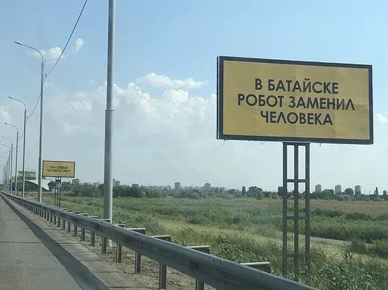 На первом баннере размещена надпись «В Батайске робот заменил человека», на втором — «Чем ответит человечество?». На третьем билборде: «Подъем пенсионного возраста и это все?». Фотографии появились в группе «Ростов-главный» во «ВКонтакте».