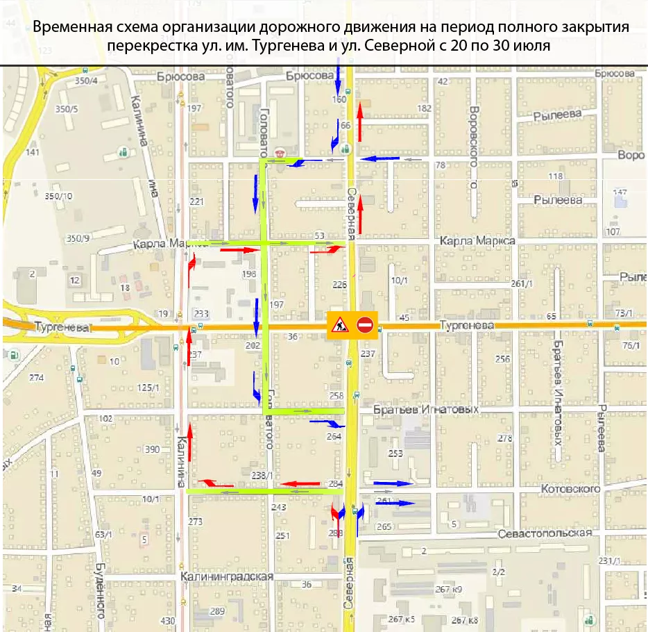 Директор департамента транспорта и дорожного хозяйства города Владимир Архипов пояснил, что такие меры примут для обустройства инженерных сетей, а также в связи с заменой ливневого коллектора на улице Тургенева. По его словам, объезд ремонтируемого участка и движение общественного транспорта организуют по улицам Котовского, Калинина, Карла Маркса, Воровского, Головатого, Братьев Игнатовых с последующим выездом на Северную. На пересечении улиц Северной и Карла Маркса изменят направление главной дороги по основному потоку движения. Для водителей установят дополнительные временные дорожные знаки.
