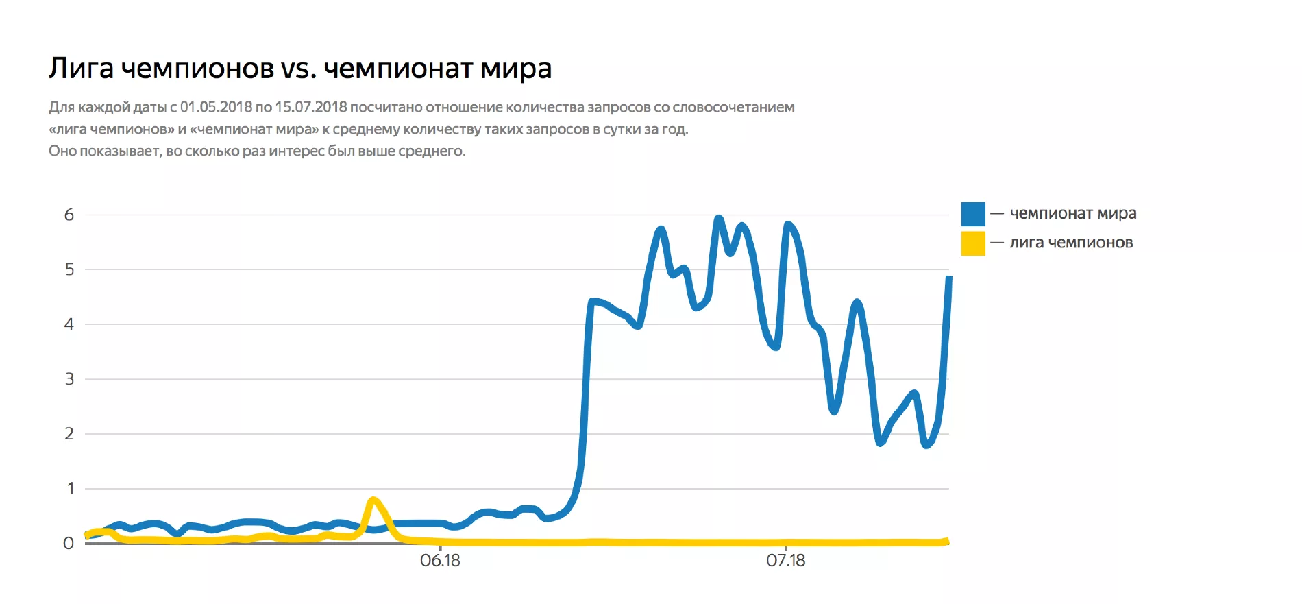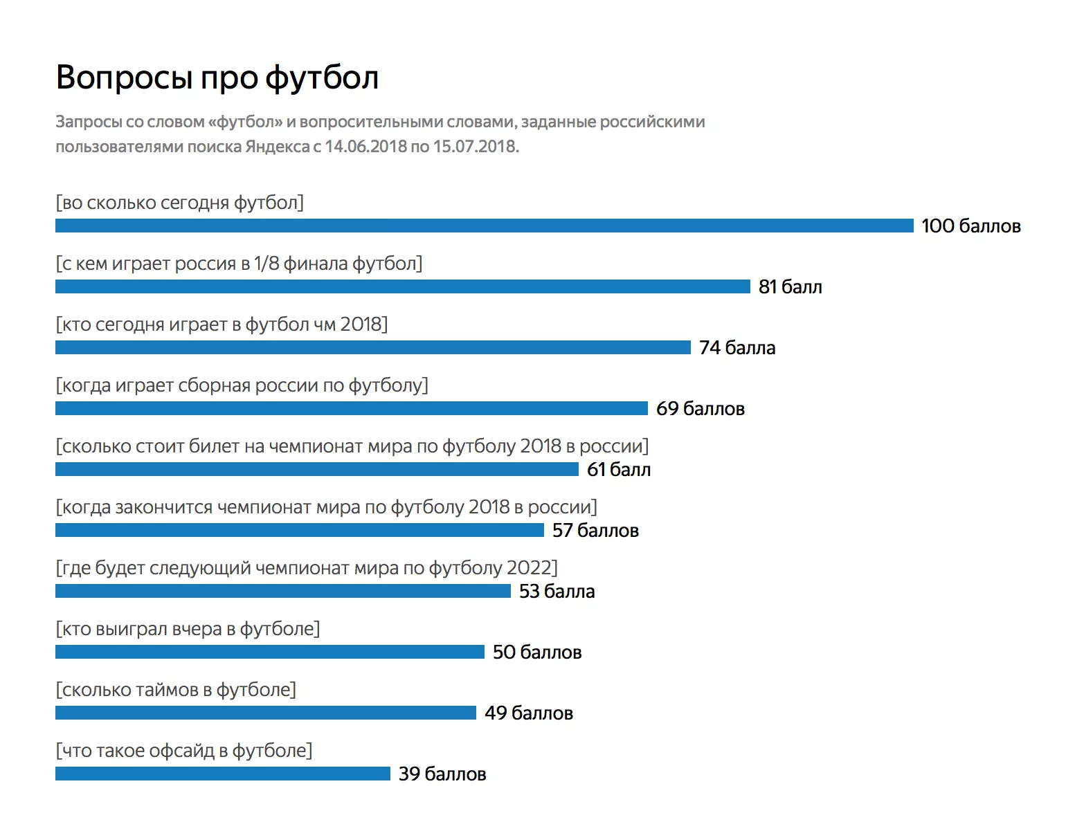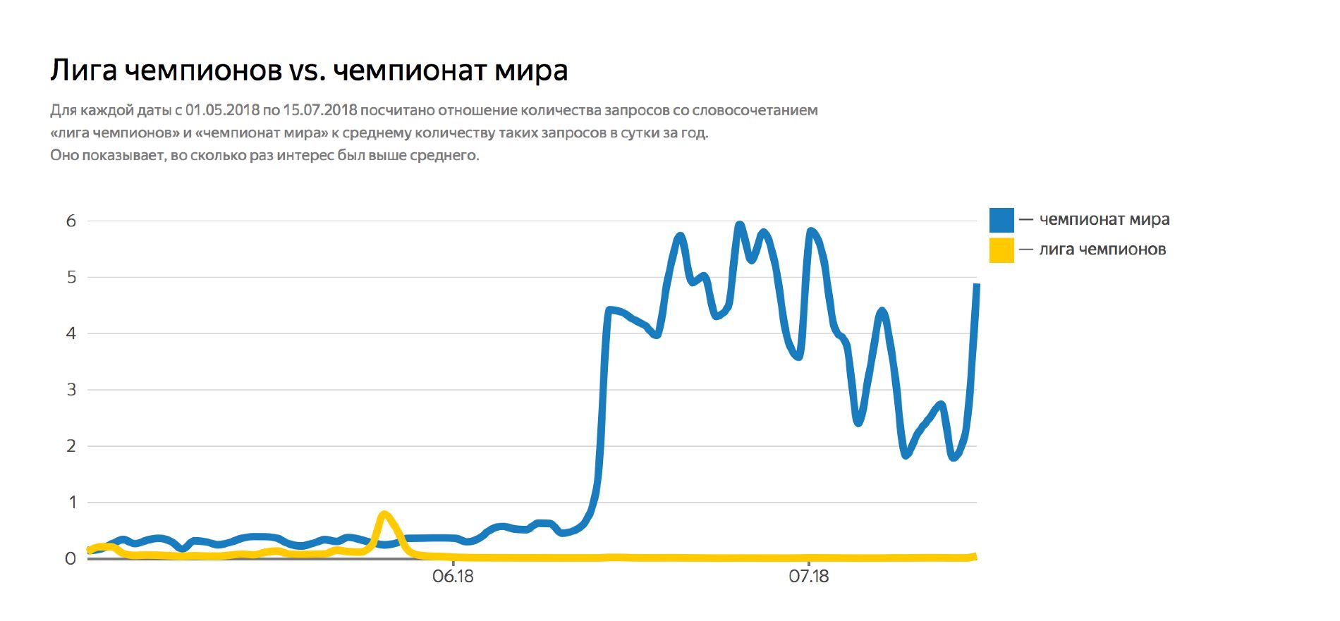 В связи с проведением чемпионата мира в России в июне-июле 2018 года аналитики изучили запросы про футбол. Наибольшее их число было зафиксировано 14 июня, 25 июня и 1 июля — когда сборная России играла с Саудовской Аравией, Уругваем и Испанией. В эти дни количество запросов было в четыре раза выше, чем про Лигу чемпионов в день финала — 26 мая.
