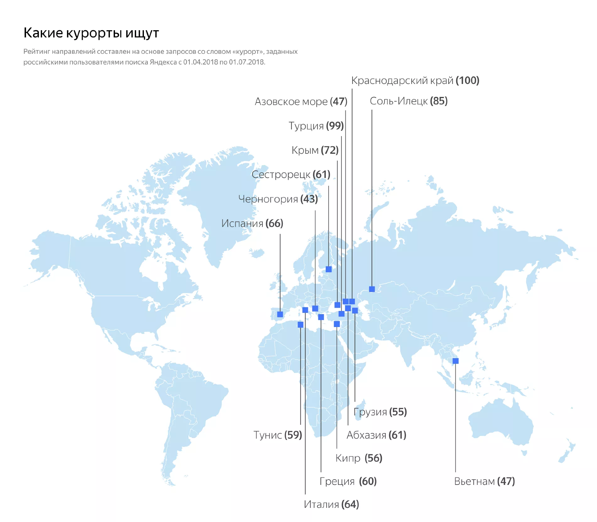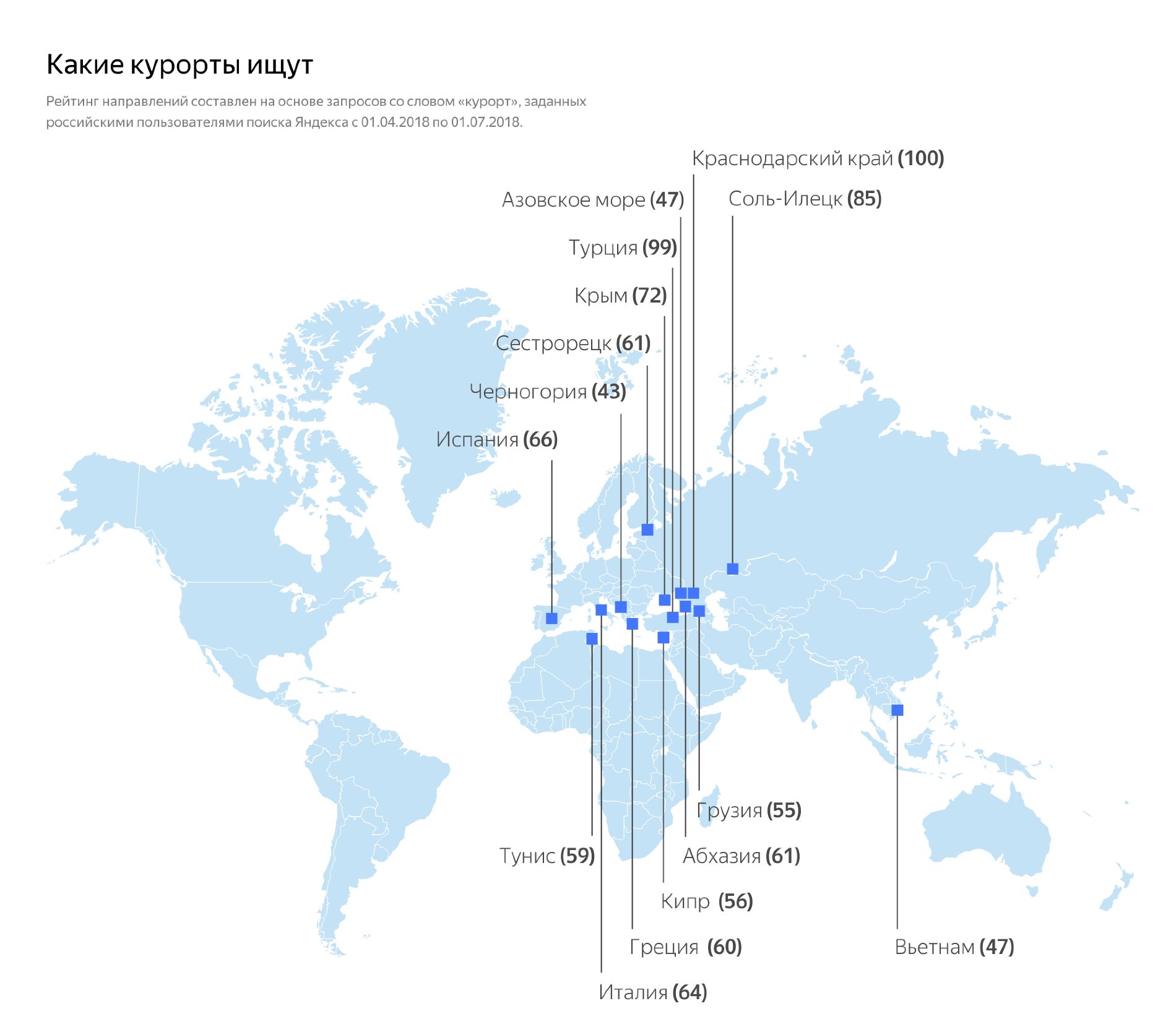Рейтинг направлений, составленный на основе запросов со словом «курорт», возглавил Краснодарский край. Среди популярных запросов: Турция, Крым, российский аналог Мертвого моря в Оренбургской области — Соль-Илецк, пригород Петербурга Сестрорецк, Азовское море, Абхазия, Грузия, Италия и Черногория, а также Вьетнам.