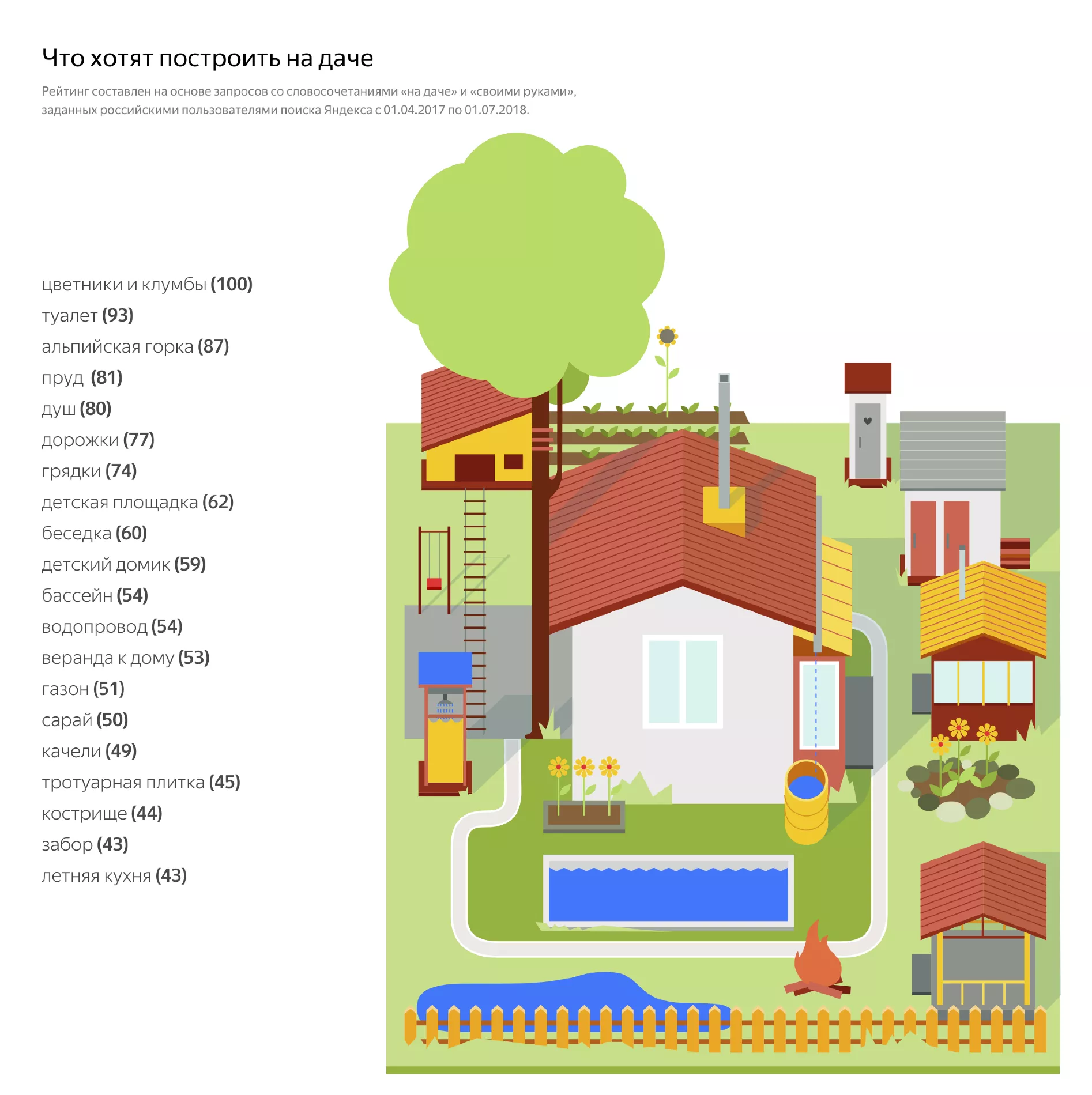 В подборке представлены рейтинги на темы, актуальные летом: мороженое и пиво, фонтаны, футбол, что построить на даче, а также что популярнее — арбуз или дыня.