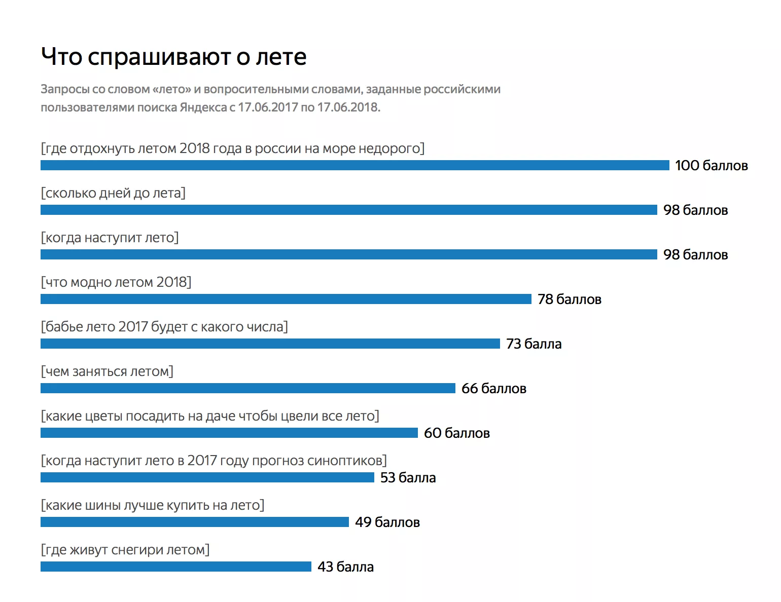 Специалисты «Яндекса» проанализировали запросы со словом «лето» и вопросительными словами, поступившие в период с июня 2017 по июнь 2018 года. Чаще всего пользователи спрашивали, где недорого отдохнуть в России на море, сколько дней до лета и когда наступит бабье лето, что будет модно этим летом и какие цветы посадить на даче, чтобы цвели все лето. Россияне также интересовались, где летом живут снегири.
