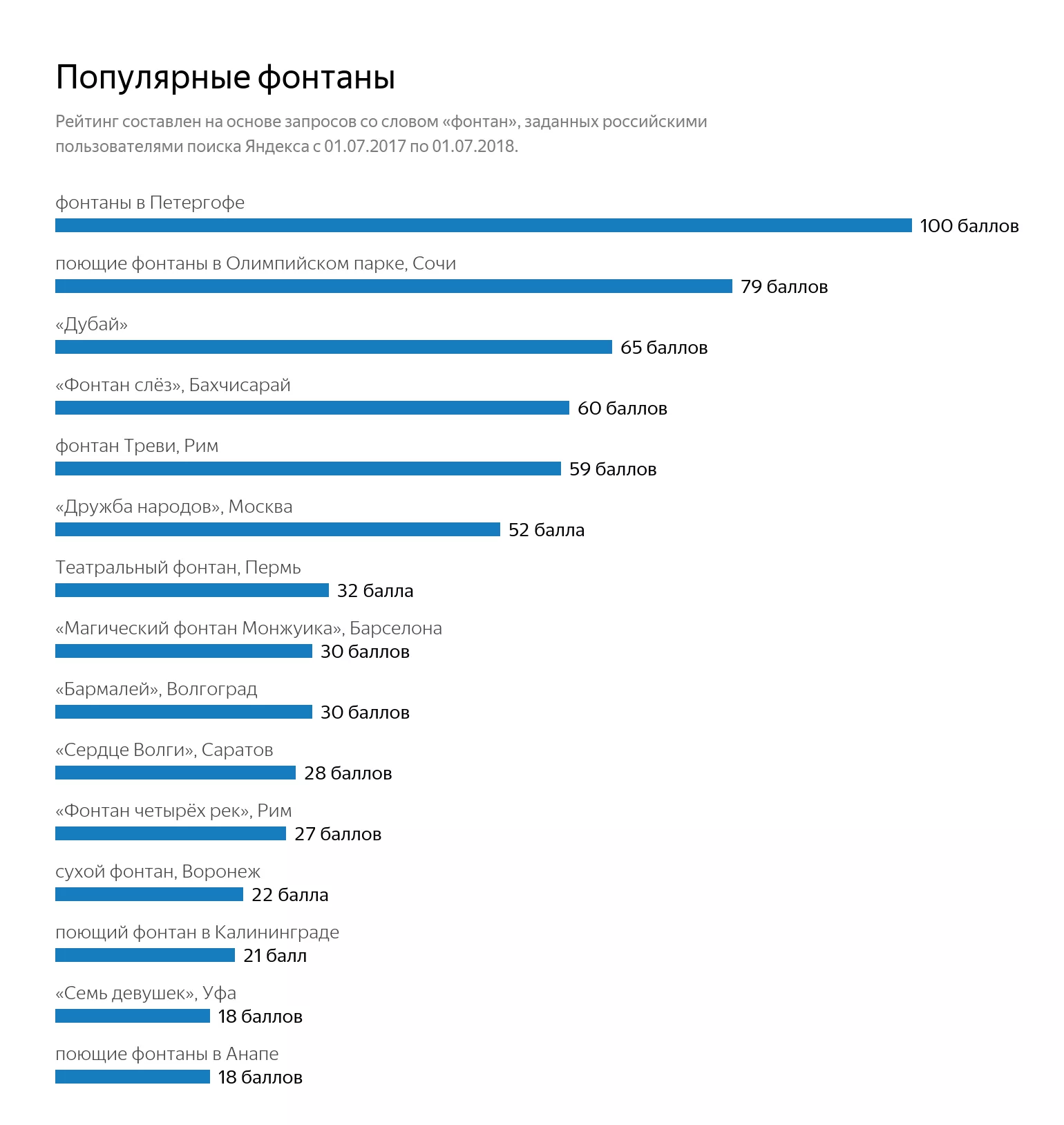 Фонтаны в Петергофе оказались самыми популярными у пользователей «Яндекса». Также россияне искали информацию о поющих фонтанах в Олимпийском парке Сочи, в Анапе и Калининграде, а также волгоградском «Бармалее» и «Фонтане слез» в Бахчисарае.