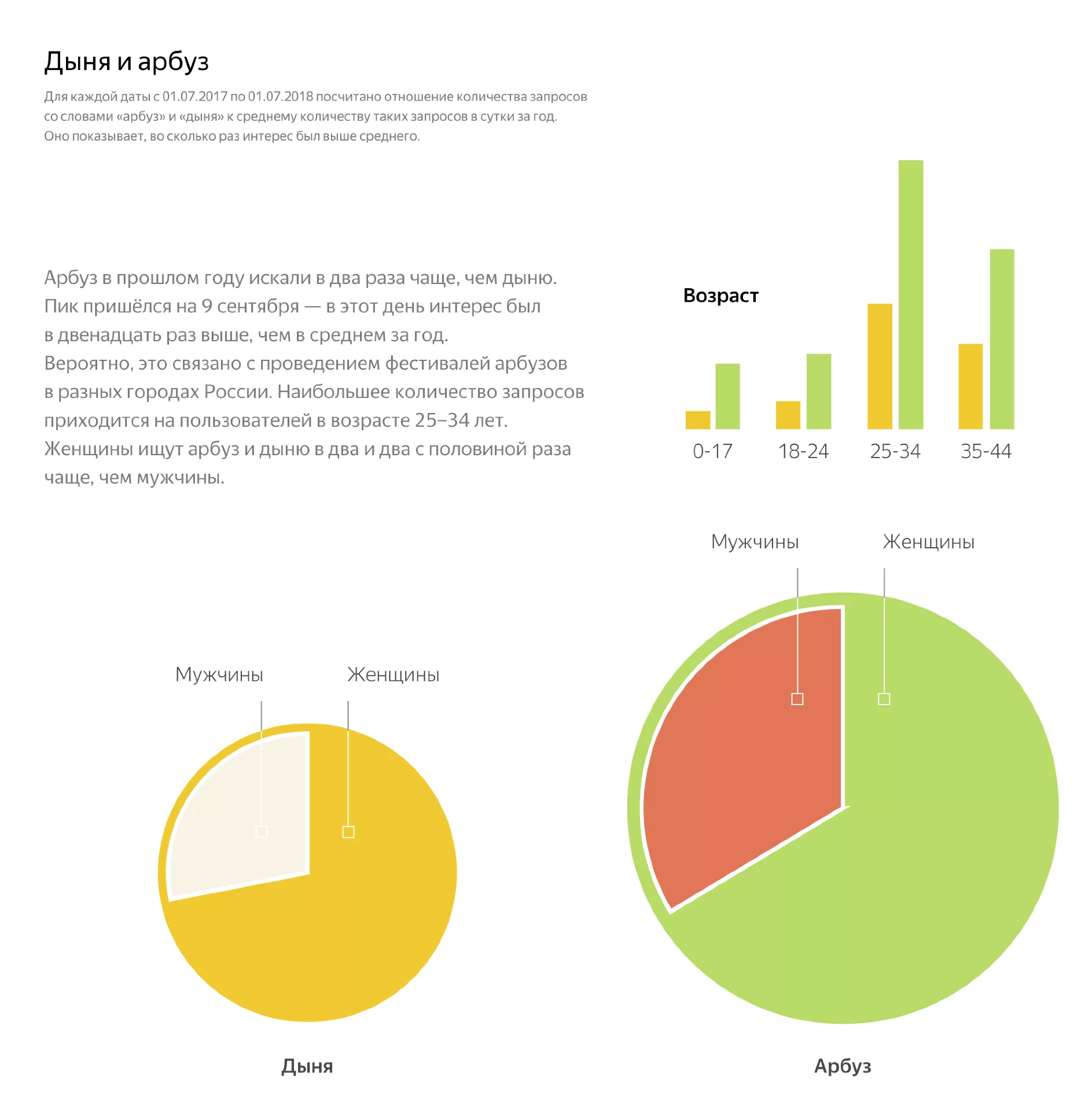 «Пик пришелся на 9 сентября — в этот день интерес был в двенадцать раз выше, чем в среднем за год. Вероятно, это связано с проведением фестивалей арбузов в разных городах России. Наибольшее количество запросов приходится на пользователей в возрасте 25-34 лет. Женщины ищут арбуз и дыню в два и два с половиной раза чаще, чем мужчины», — рассказали в пресс-службе «Яндекса».