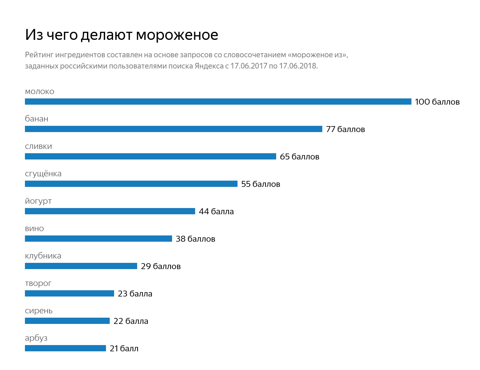 В рейтинг ингредиентов для мороженого, составленный на основе запросов со словосочетанием «мороженое из», помимо банана, сгущенки и клубники, попали вино, творог и сирень.