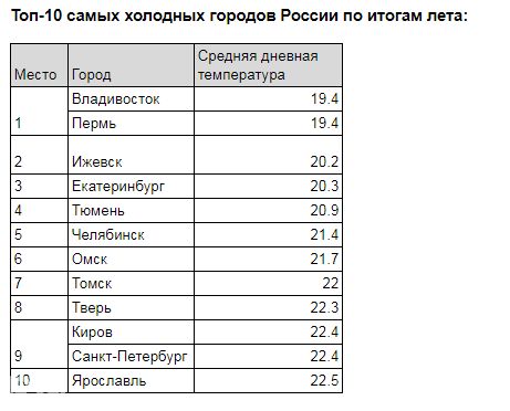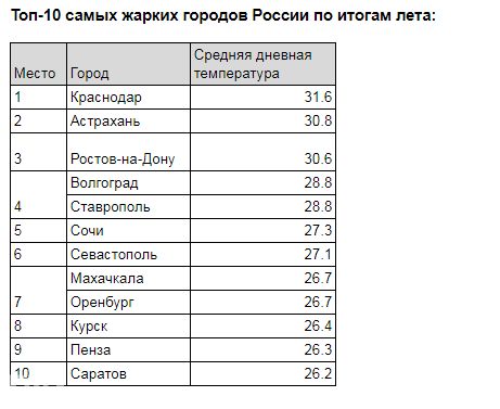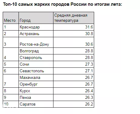 Ростов-на-Дону занял третье место со средней температурой 30,1 °С. Также в десятку вошли Ставрополь, Сочи, Севастополь и Махачкала.