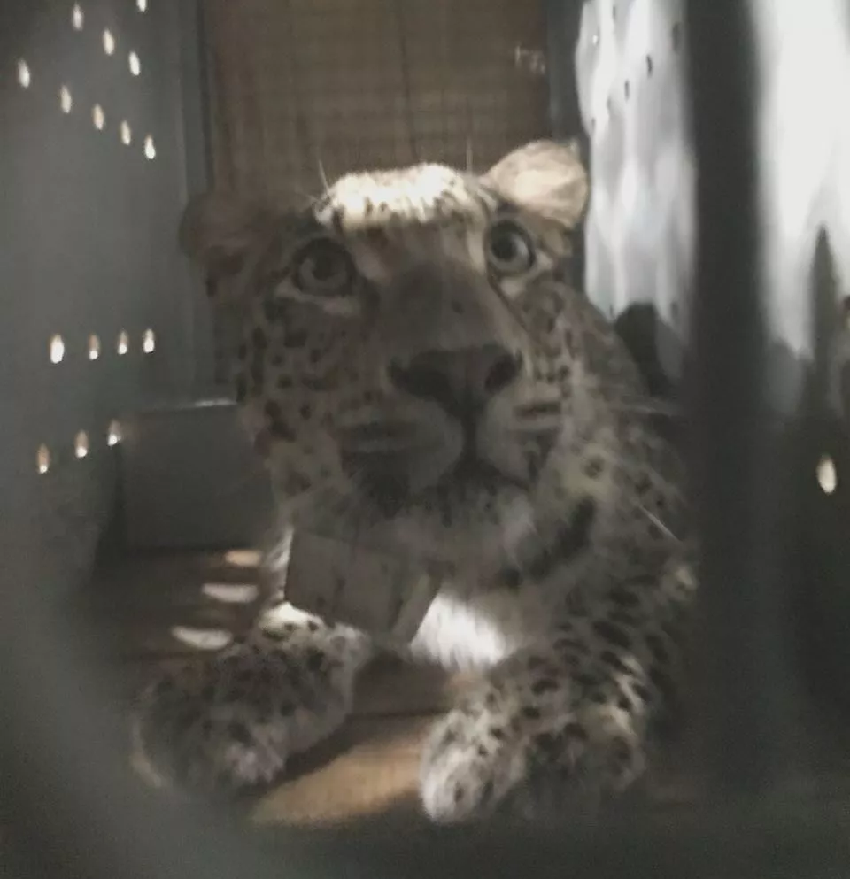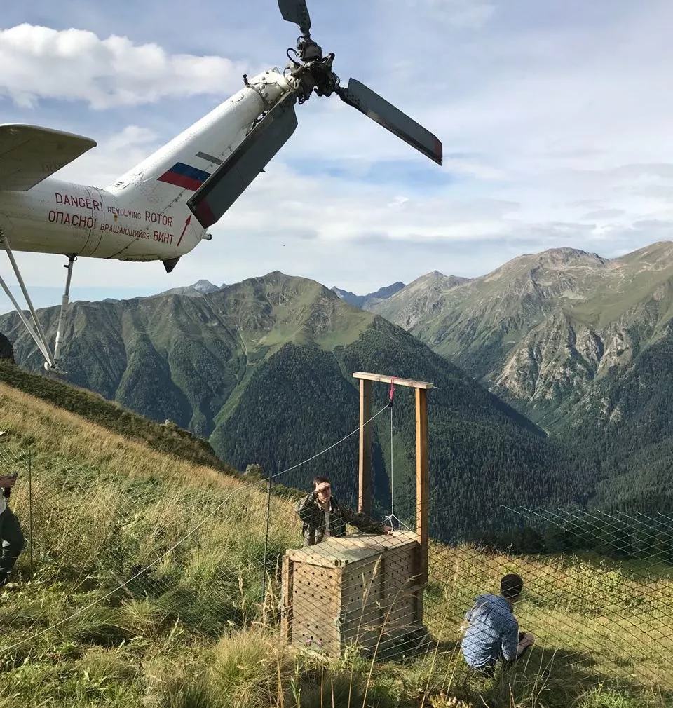 Животное транспортировали на вертолете в специальной клетке на гребень горы Ахцархва, где впервые выпустили трех леопардов в июле 2016 года.