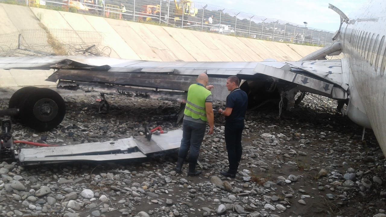 В аэропорту Сочи 2 сентября у самолета, который накануне выкатился за пределы взлетно-посадочной полосы и загорелся, продолжают дежурить спасатели