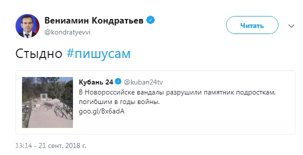 Новость прокомментировал губернатор Краснодарского края Вениамин Кондратьев на своей странице в твиттере. Он опубликовал ссылку на новость «Кубань 24» и подписал: «Стыдно. Пишу сам».