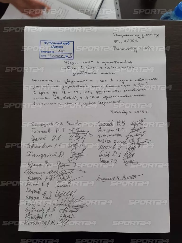 Об этом 4 октября сообщило издание Sport24.ru. Футболисты написали письмо на имя гендиректора клуба Олега Флегонтова, в котором уведомляют о намерении приостановить выполнение трудовых обязанностей с 19 октября, если до 18 октября им не выплатят долги как минимум по двум зарплатам. Под письмом стоит 23 подписи.