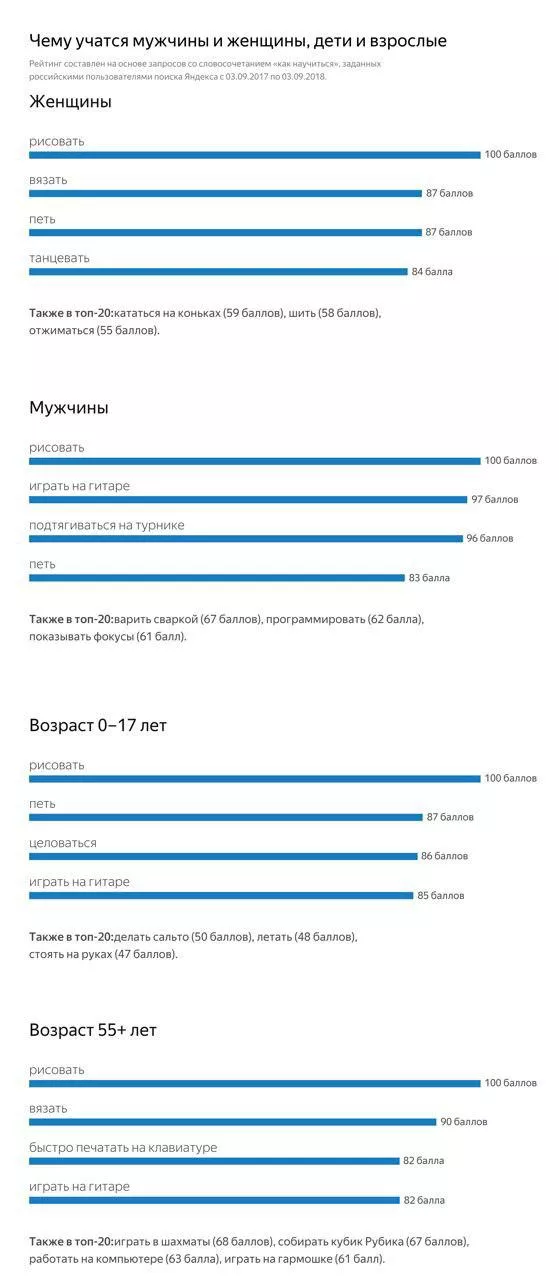 Интересно, что умение рисовать стоит на первом месте у всех возрастных групп пользователей. Игра на гитаре в топе у мужчин, подростков и пожилых людей, пение — у всех групп, кроме категории 55+. Последних больше интересует умение быстро печатать. Женщинам также интересно вязание, подросткам — поцелуи, а мужчинам — подтягивания.