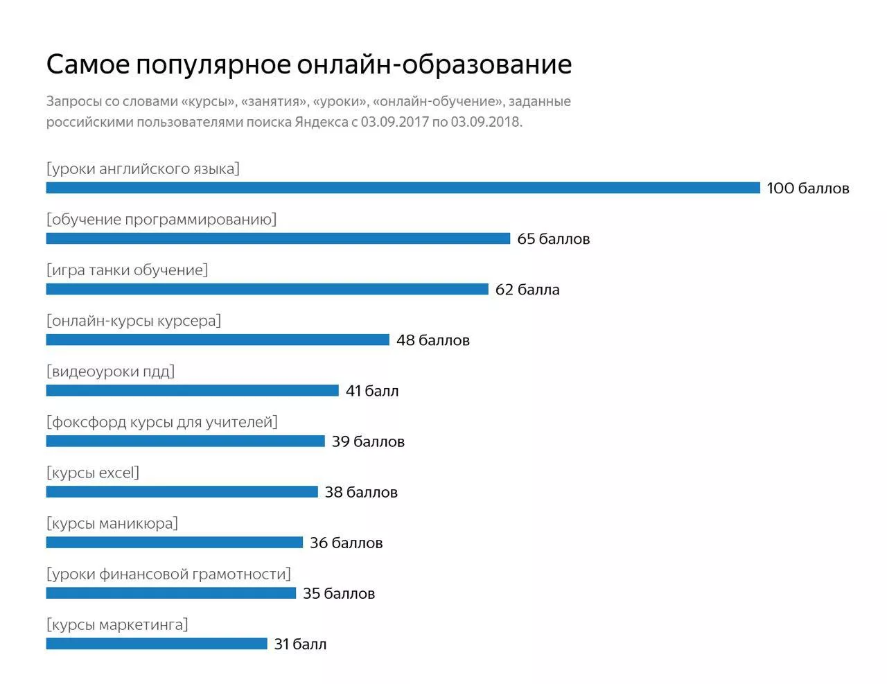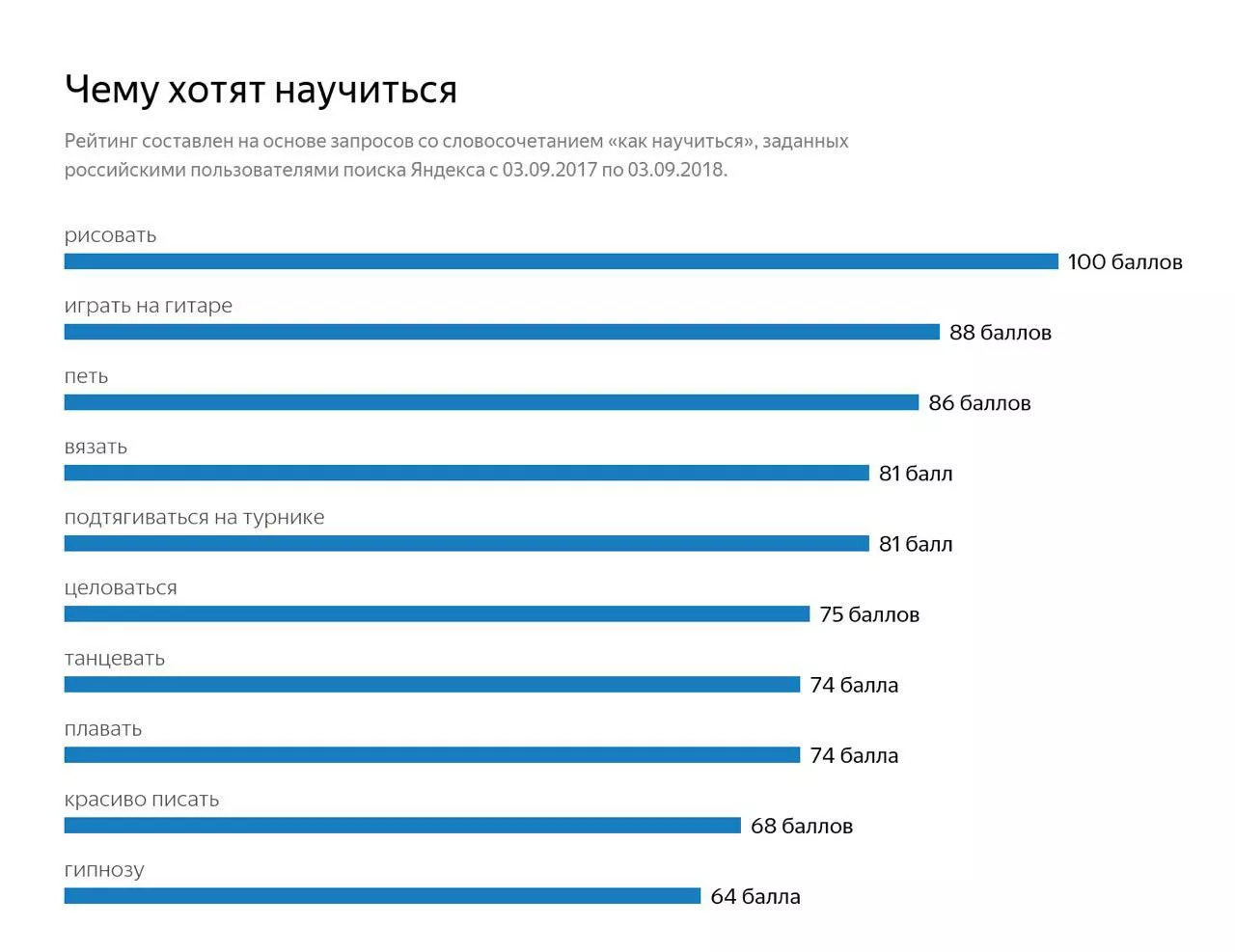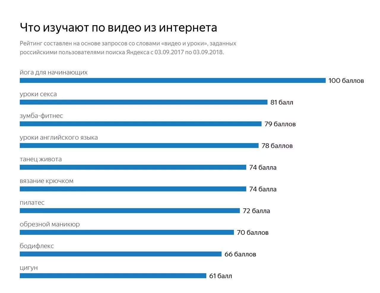 Популярность запросов оценивалась по стобалльной шкале: чем выше частота запроса, тем выше балл. Учитывались запросы российских пользователей поиска «Яндекса» за год — с 3 сентября 2017 года по 3 сентября 2018 года.