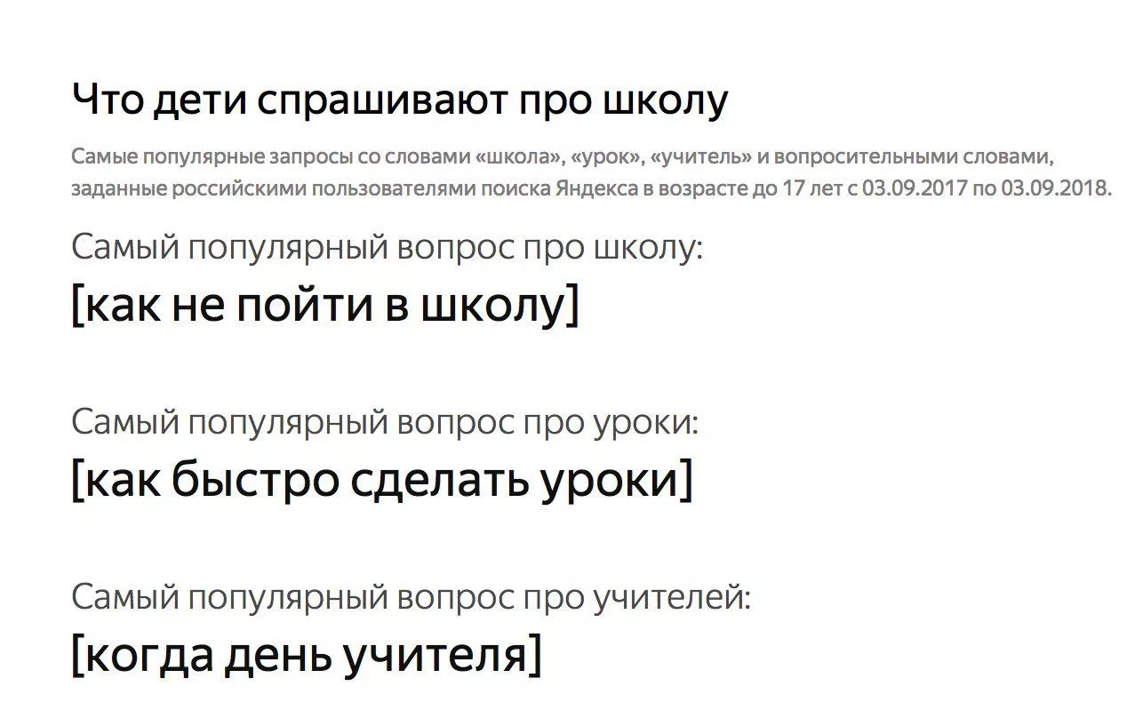 У детей самый популярный вопрос про школу звучит так: «Как не пойти в школу». Также они хотят сделать уроки побыстрей и знать наверняка, когда поздравить своих учителей с профессиональным праздником.