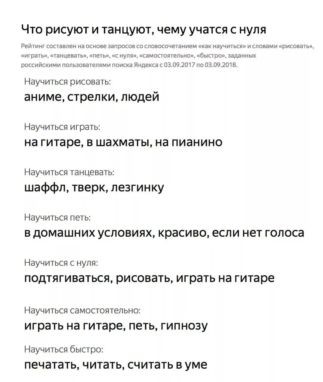 Петь, если нет голоса, танцевать тверк и лезгинку, целоваться и выполнять асаны йоги. «Яндекс» рассказал, чему хотят учиться россияне