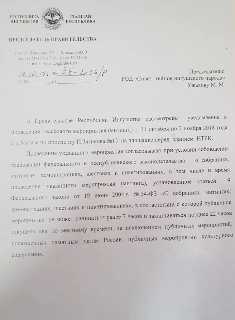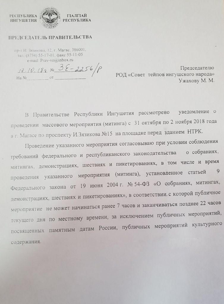 «В правительстве Ингушетии рассмотрено уведомление о проведении массового мероприятия (митинга) с 31 октября по 2 ноября 2018 года по проспекту И.Зязикова № 15 в Магасе на площадке перед зданием НТРК. Проведение указанного мероприятия согласовываю при соблюдении требований республиканского и федерального законодательства о собраниях, митингах, демонстрациях», — говорится в документе, размещенном на сайте правительства Ингушетии.