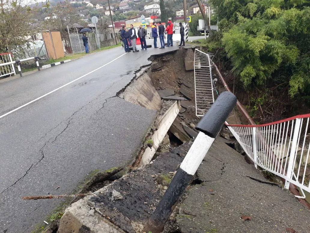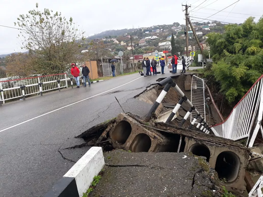 ЧП произошло на 4-м км трассы Адлер — Нижняя Шиловка. По предварительной информации, это случилось в связи с повышением уровня воды в русле реки Чахцуцыр. Мост подтопило и его часть оказалась разрушенной.