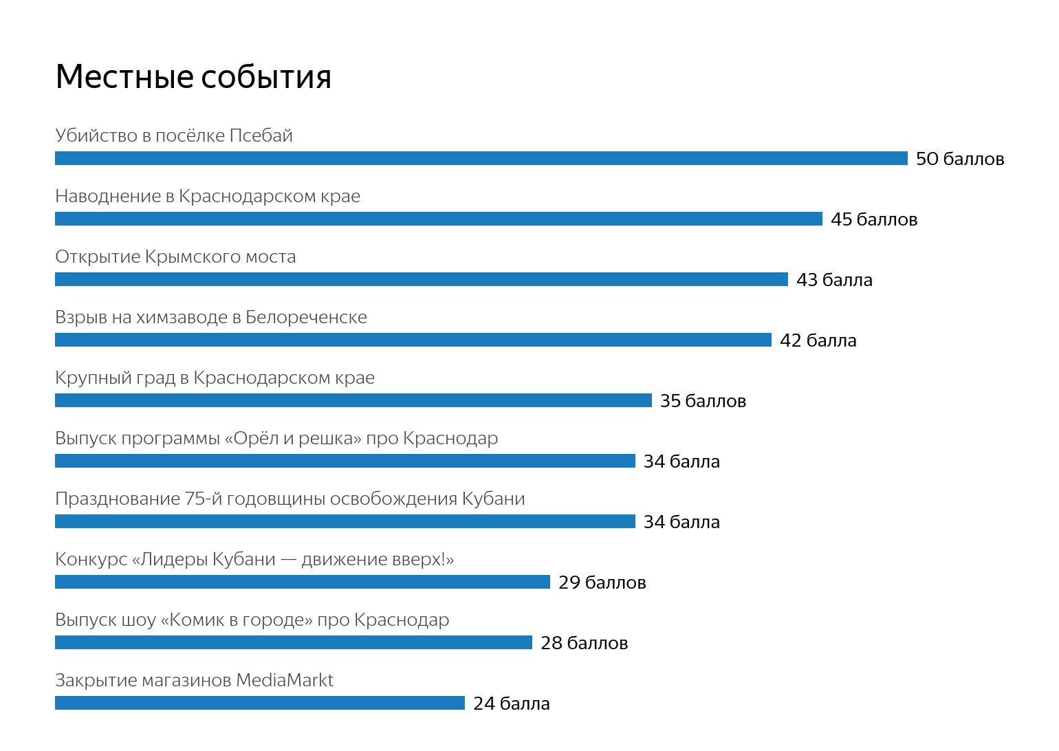Краснодарский рейтинг событий возглавило дело об убийстве многодетной матери в поселке Псебай, которое произошло в мае 2018 года. Следом идут наводнение на Кубани и открытие Крымского моста. В топ-10 попали взрыв на химзаводе в Белореченске, крупный град в Краснодарском крае, выпуск передачи «Орел и решка» про Краснодар, а также празднование годовщины освобождения Кубани от немецко-фашистских захватчиков.