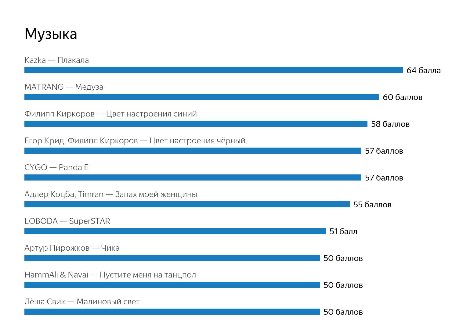 На первом месте самых популярных музыкальных композиций оказалась песня «Плакала» украинской группы Kazka. В топ-10 вошли треки «Медуза» от MATRANG, «Цвет настроения синий» Филиппа Киркорова и «Цвет настроения чёрный», которую он исполнил с Егором Кридом. В рейтинг также вошли Светлана Лобода с песней «SuperSTAR», Артур Пирожков с песней «Чика» и Леша Свик с «Малиновым светом».