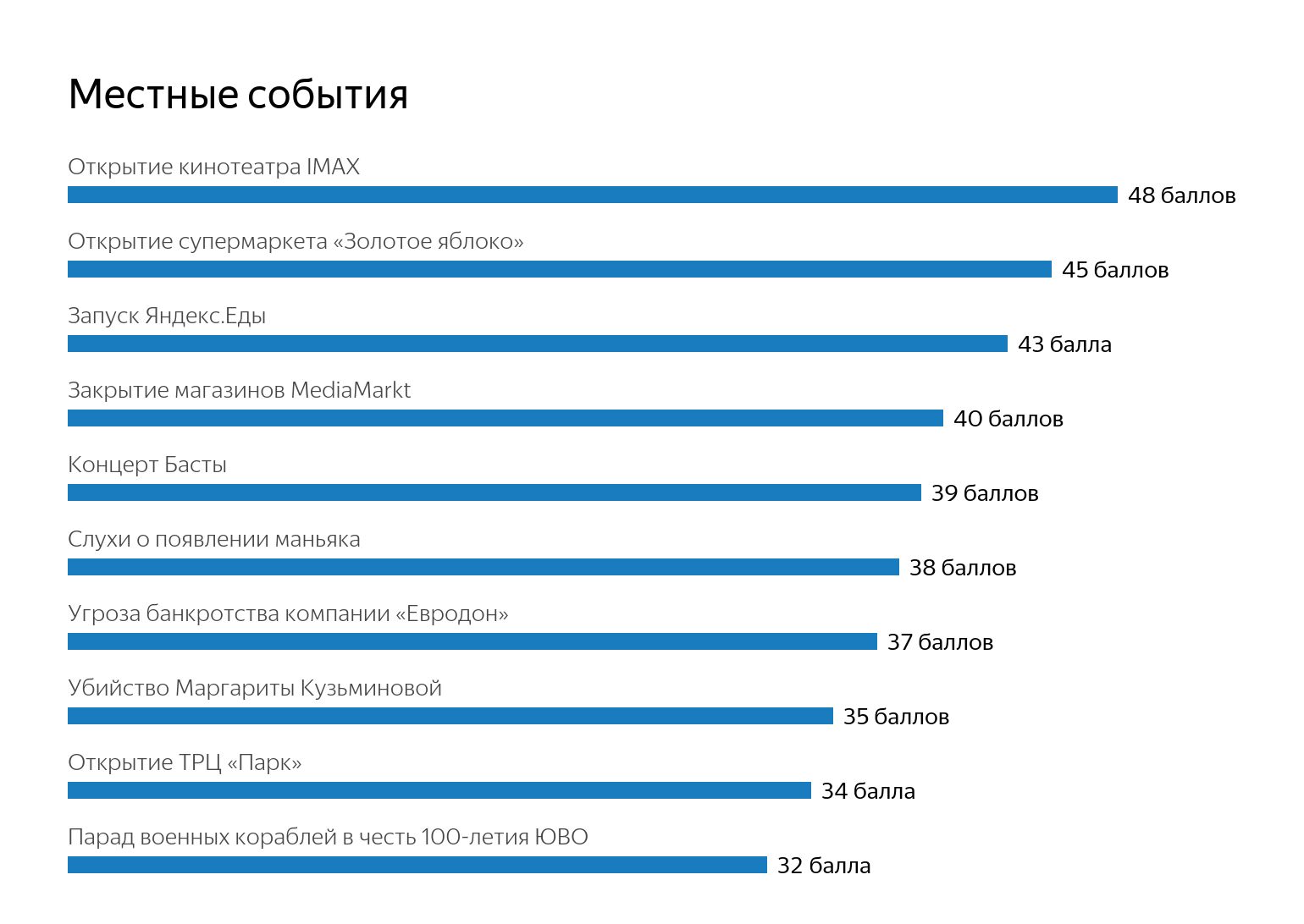 Среди местных событий, оказавшихся в центре внимания, значится открытие кинотеатра IMAX, ТРЦ «Парк» и супермаркета «Золотое яблоко», запуск «Яндекс.Еды», закрытие магазинов MediaMarkt, концерт рэпера Басты, слухи о появлении маньяка, угроза банкротства компании «Евродон», убийство Маргариты Кузьминовой, парад военных кораблей в честь 100-летия ЮВО.