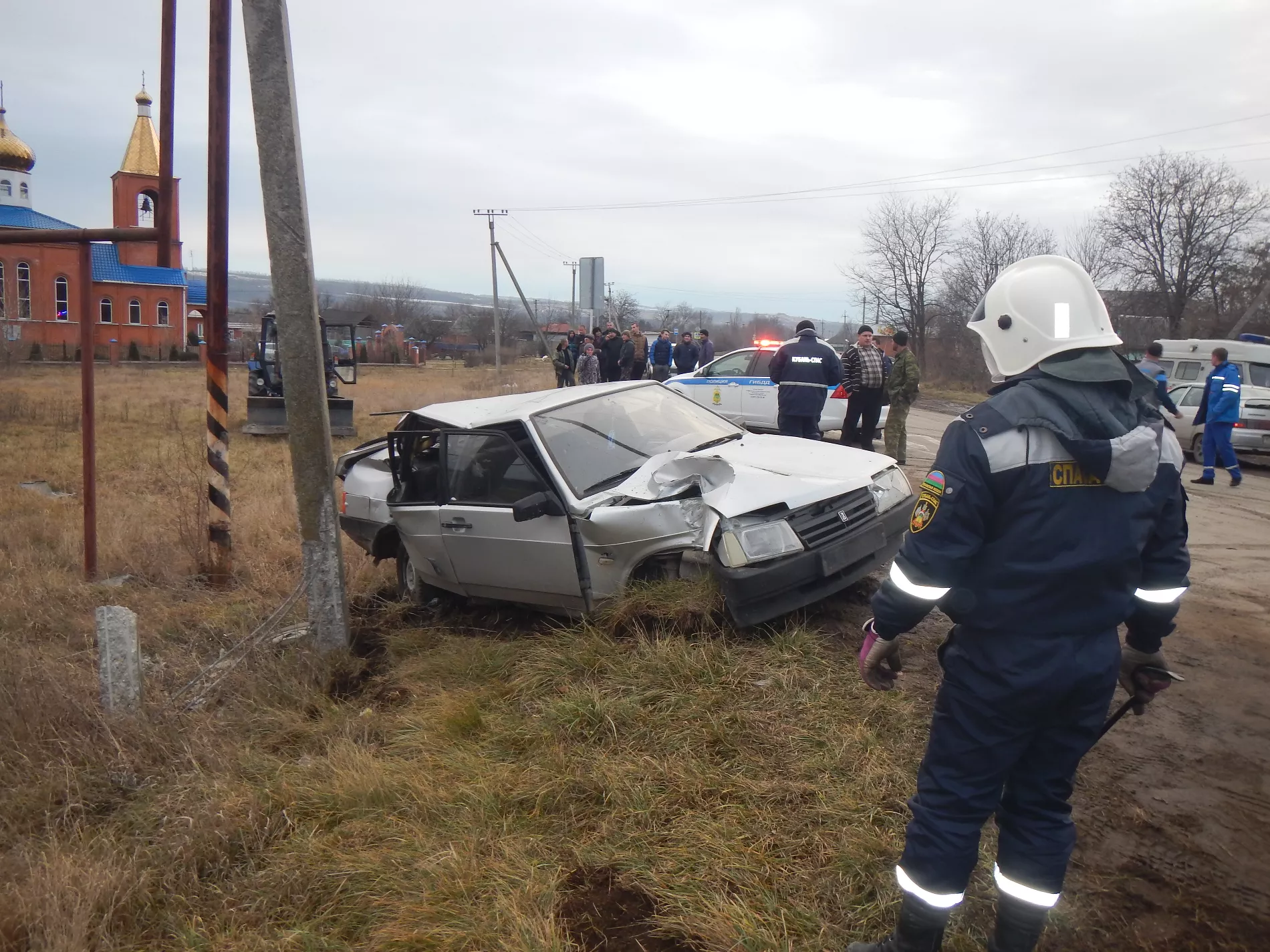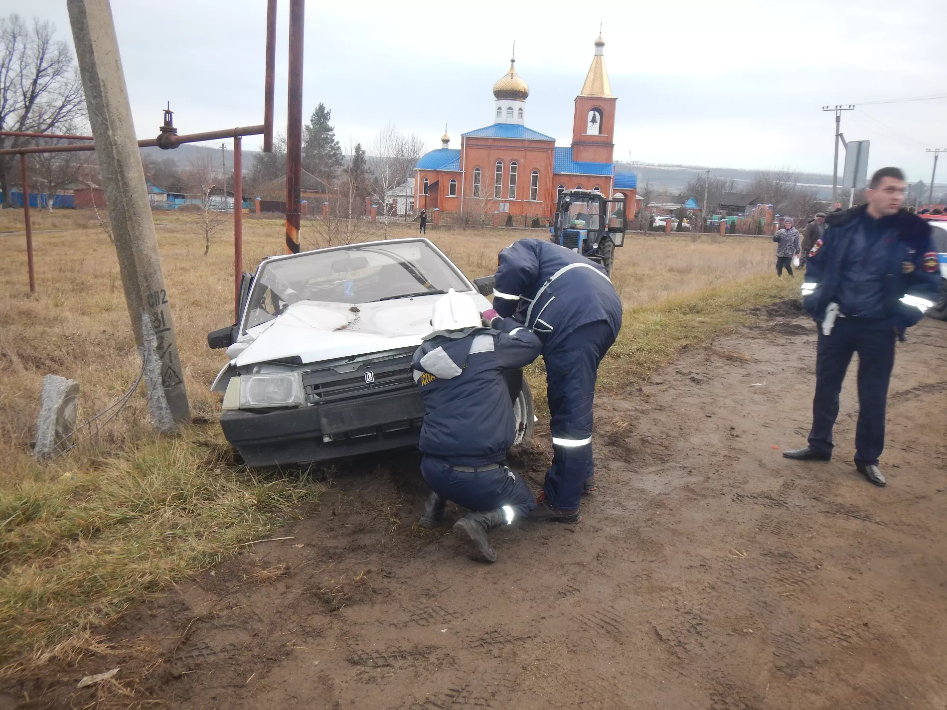Авария произошла в станице Спокойной. По предварительным данным, водитель ВАЗ-2109 не справился с управлением, съехал с дороги и врезался сначала в бетонную электроопору, а затем в газовую трубу.