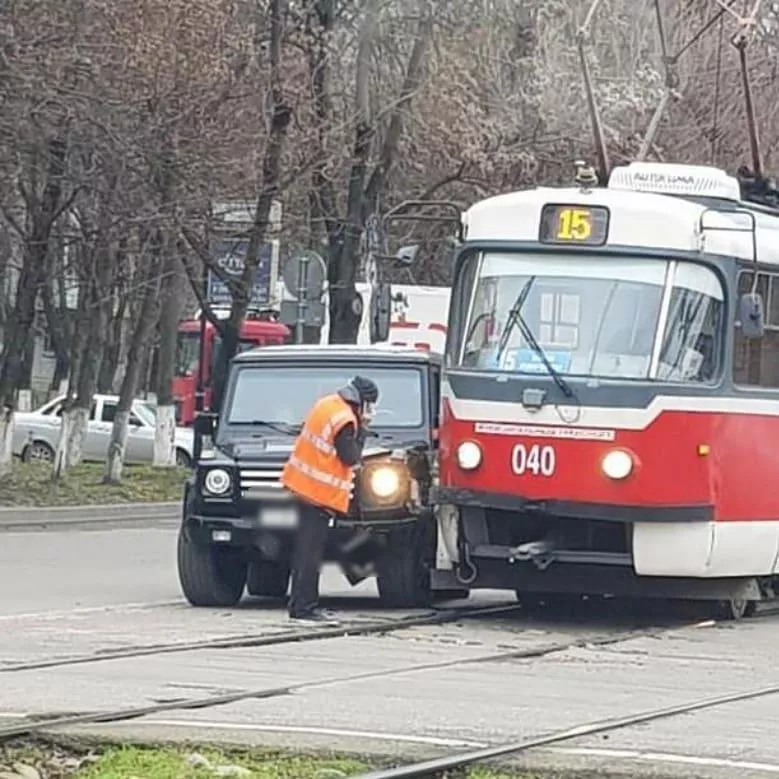 Автомобиль Mercedes Gelandewagen днем 17 декабря столкнулся с трамваем на улице Московской в Краснодаре